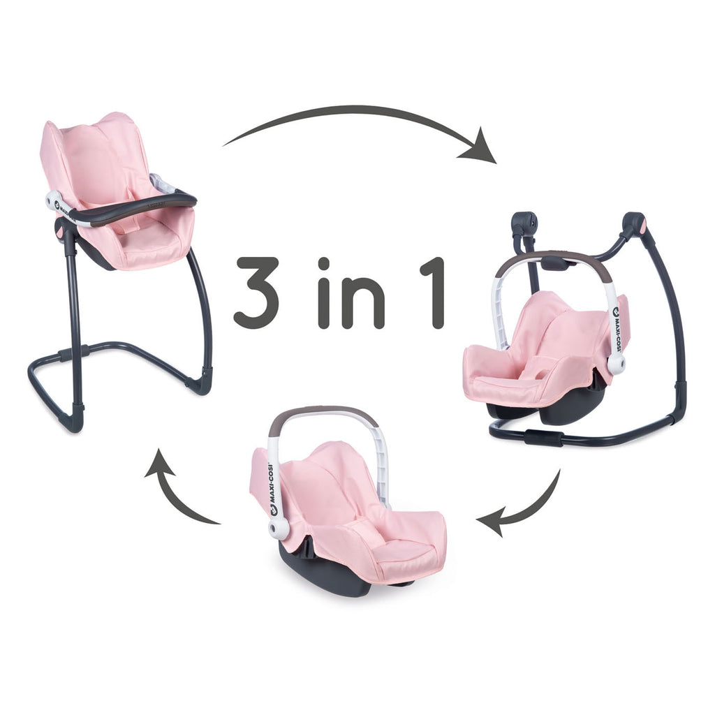 3in1 Maxi-Cosi stoel van Smoby. Deze zachtroze multifunctionele stoel is voor alle poppen tot 42 centimeter (niet inbegrepen). De zitting is gemaakt van stevig kunststof met een stoffen hoes in zachtroze en de poppenstoel heeft een zwart metalen frame. Geschikt voor kinderen van 3 jaar en ouder.