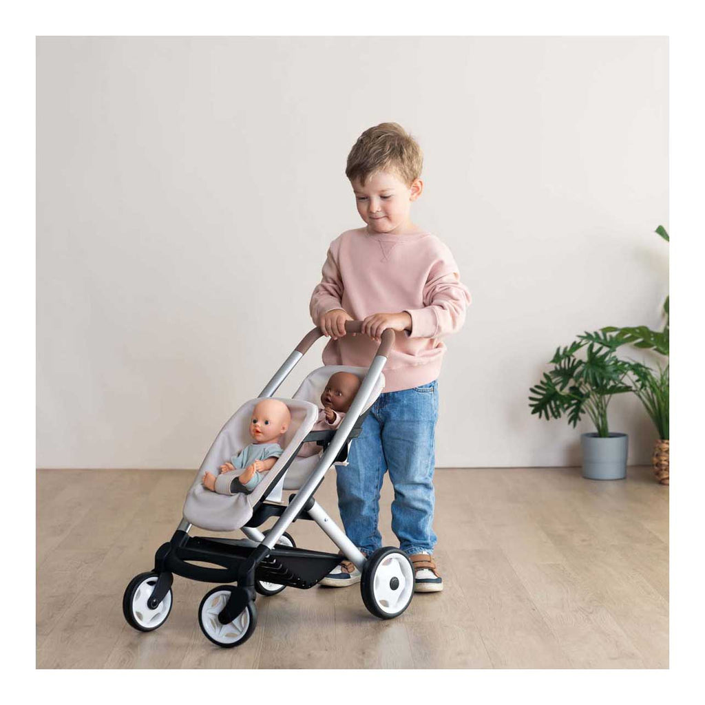 Beige Maxi-Cosi poppenwagen voor twee poppen, met verstelbare zitjes, stille zwenkwielen en opbergmand. Afmetingen: 54,5 × 38,5 × 64 cm. Geschikt vanaf 3 jaar. Gemaakt in Spanje.