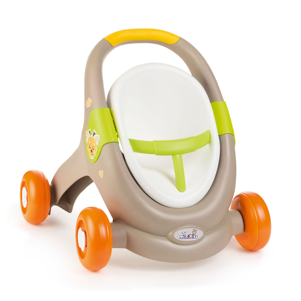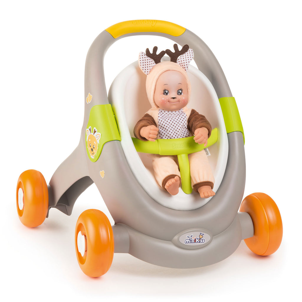 De Minikiss Animal Baby Walker Vos is een 3in1 kinderwagen. De babywalker is een loophulpmiddel voor de peuter, een kinderwagen voor de babypop en een maxi-cosi. De kinderwagen wordt exclusief pop geleverd.