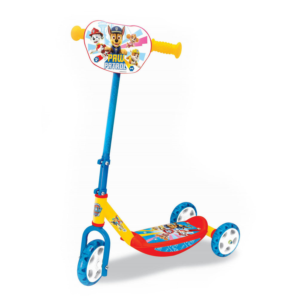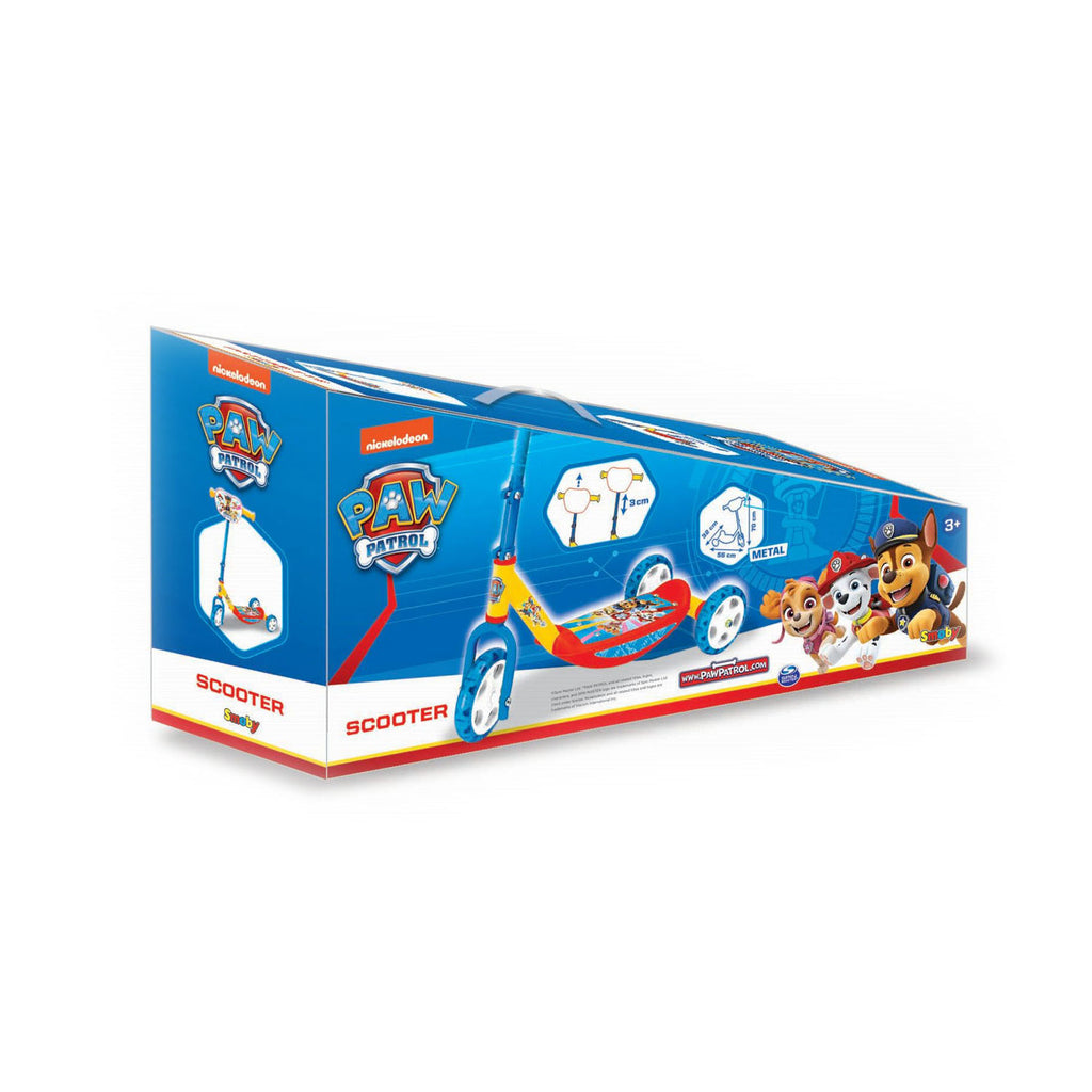 Driewielerstep met gelwielen van PAW Patrol met in hoogte verstelbaar stuur en metalen frame. Het stuur is 70 cm hoog, op het breedste punt is de step 32 cm en de lengte is 56 cm.