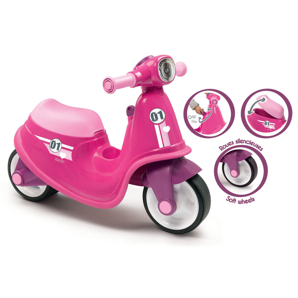 De Smoby Scooter Ride On roze is ideaal voor de beginnende rijder en valt door de vormgeving zeker op! De scooter is gemaakt van stevig kunststof en heeft de kleuren licht- en donkerroze en paars. Draai de contactsleutel om en het lijkt alsof je de scooter start. Verder heeft de scooter soft wielen die ervoor zorgen dat rijden met de scooter geruisloos gaat. De voorkant van de Smoby scooter is voorzien van een kunststoffen voorlamp die heel realistisch lijkt. Onder het lichtroze zitje is er nog plek om speelgoed mee te nemen of andere spulletjes.