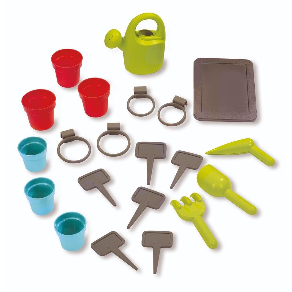 Speelhuisje van Smoby in tuinhuis design. Het huisje heeft 1 halve deur, 2 ramen met paneelluiken en 2 patrijspoorten. Het huisje bevat een plantenbak, latwerk voor bloempotten en vogelvoeder en een regenton met gieter. Er is een mobiele werktafel en veel opbergruimte voor accessoires. Er zijn 21 inbegrepen accessoires zoals gereedschap, potten, spandoeken, en een tuinboekje. Het kunststof tuinhuisje is stevig en heeft een anti-UV-behandeling. Geschikt voor kinderen vanaf 2 jaar.
