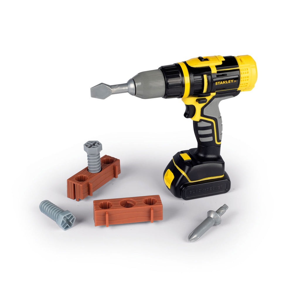Smoby Stanley Boormachine met twee bitjes. In de set zitten twee bouwplankjes en twee schroeven. De boormachine werkt niet op batterijen, maar draait wel echt rond.