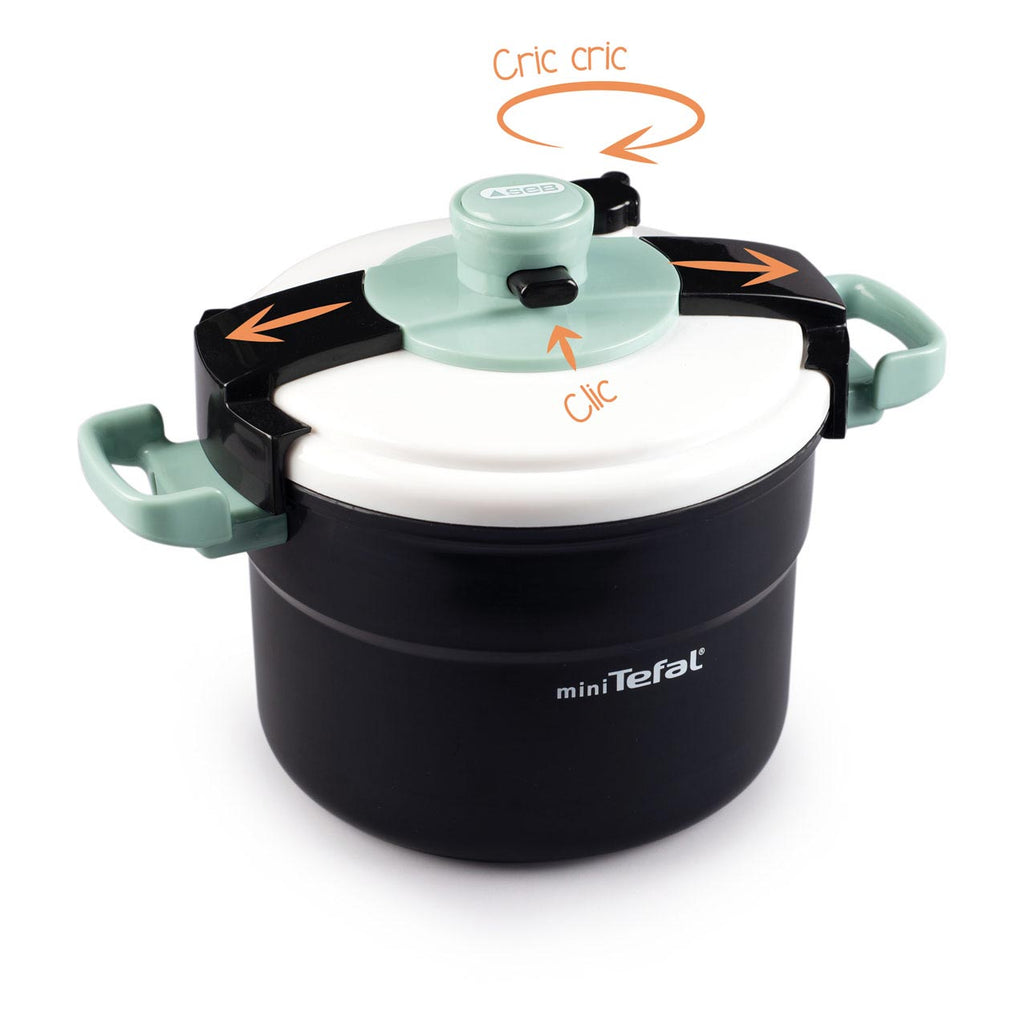 Speelgoed snelkookpan van Smoby en Tefal. Druk op de clip om de pan te openen en sluiten. Vul hem met groenen en speelgoedeten voor het maken van een heerlijke maaltijd. Afmetingen: 18,5 x 12,5 x 12 centimeter. Geschikt voor kinderen vanaf 3 jaar.