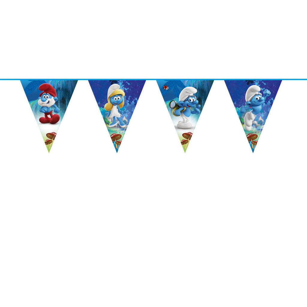 Maak je feestversiering compleet met deze smurfen vlaggenlijn. De kunststof blauwe vlaggenlijn is 10 meter lang heeft afbeeldingen van al je favoriete smurfen op beide zijden van de wimpels.