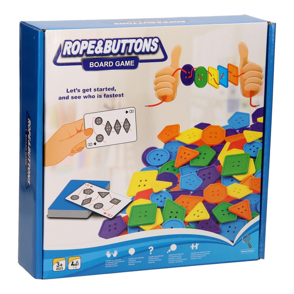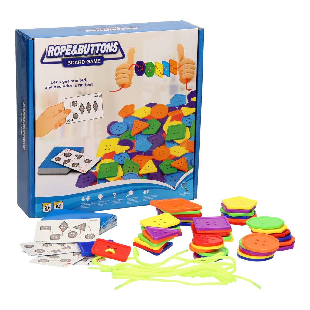 Rijg zo snel mogelijk de knopen na van de voorbeeldkaarten van het Behendigheidsspel Touw & Knopen! Gooi alle gekleurde knopen op tafel, draai om de beurt een kaart om en ga aan de rijg. Degene die het snelst klaar is, krijgt de kaart. Winnaar van het Behendigheidsspel Touw & Knopen is degene die op het einde van het spel de meeste kaarten heeft verzameld. Het spel bevat 54 voorbeeldkaarten, 4 rijgtouwen, 48 verschillende knopen en een handleiding. Geschikt voor kinderen vanaf 3 jaar.