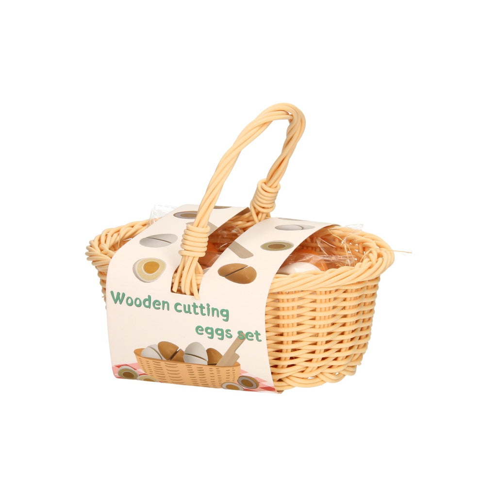 Kunststof rieten mandje met houten eieren die je met het houten mes doormidden kunt snijden en vervolgens weer aan elkaar kunt plakken.