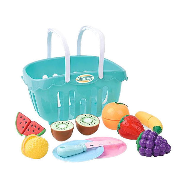 Turquoise winkelmandje gevuld met snijfruit, twee bordjes en een kunststof mesje. Inhoud: meloen, kiwi, banaan, aardbei, druiven en geel drakenfruit.