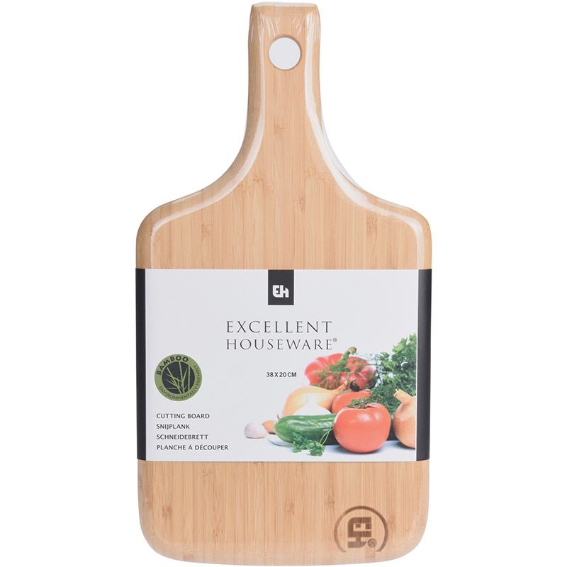 Handzame snijplank met handvat vervaardigd uit bamboe. Bamboe beschadigt het mes niet en neemt nauwelijks vocht op. De snijplank is rondom afgerond, dus geen scherpe hoeken en randen.