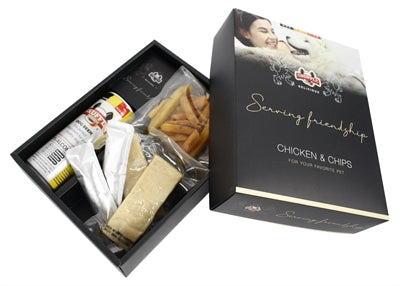 De Snuffle Kip En Patat Box 670 gr is een leuke snackbox voor de hond met kip, friet en bier speciaal voor de hond. Met recht een ‘snack’-box! Deze leuke cadeauverpakking bevat een heerlijke combinatie van producten uit de Vlaamse snackbar, namelijk knapperige frietjes, kip met dressing én hondenbier, de perfecte traktatie voor elke feestelijke gelegenheid. En helemaal veilig voor jouw viervoeter, want alle producten zijn gemaakt van natuurlijke ingrediënten én natuurlijk alcoholvrij. Schudt het bier even en alles is direct klaar voor gebruik, en aan te bieden op kamertemperatuur. Deze lekkere verwennerij komt in een sjieke cadeauverpakking, waarin alles zo verpakt is dat je jouw hond twee keer van zo’n lekkere maaltijd kunt laten genieten.