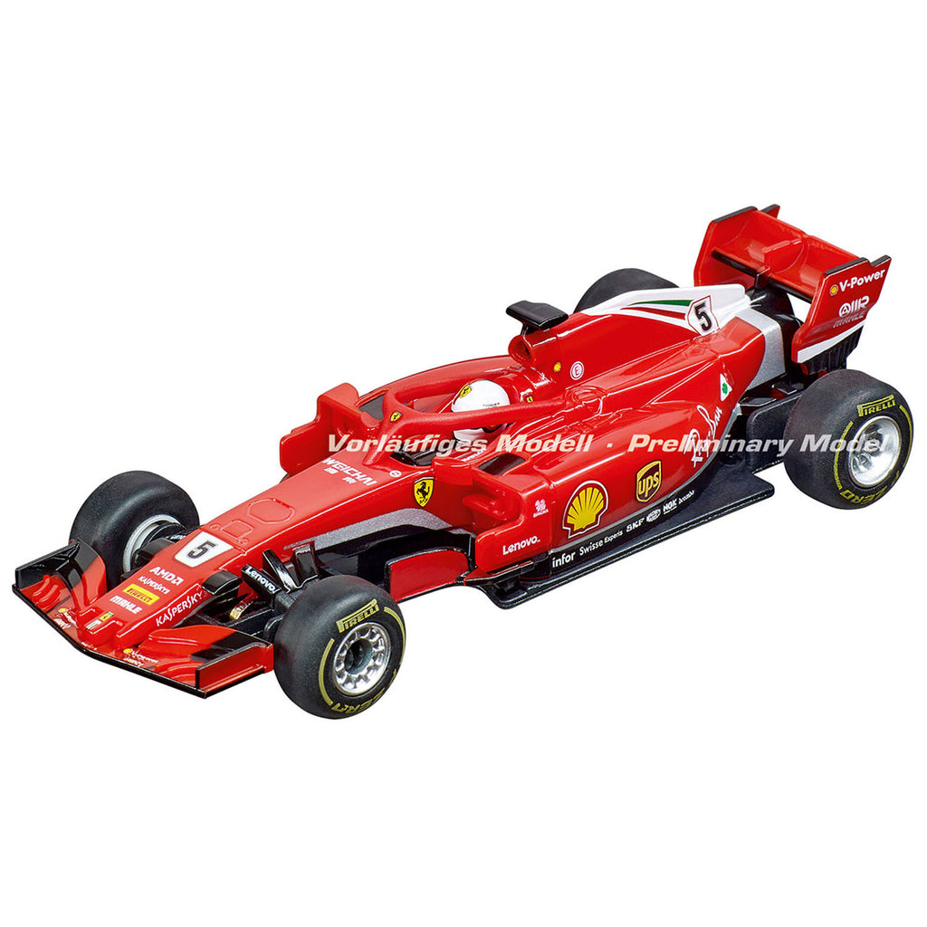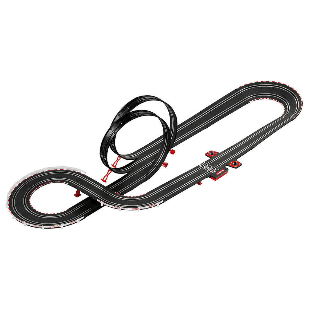 De rode Ferrari SF71H 'S. Vettel, No.5' gaat de strijd aan tegen de blauwe Mercedes-AMG F1 W09 EQ Power+ 'L.Hamilton, No44' op de Carrera GO!!! Racebaan - Speed Grip! Ze racen op een 5,3 meter lange baan met de volgende uitdagingen:2 loopings, scherpe bochten en een hogesnelheids rechte baan. De Carrera GO!!! Racebaan - Speed Grip is inclusief 2 auto's, GO!!! Plus Handregelaar en GO!!! Transformator EU oplader.