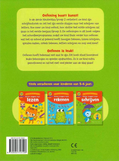 Oefening baart kunst! In de derde kleuterklas/groep 2 verbetert uw kind zijn schrijfmotoriek en zet het zijn eerste stapjes naar het schrijven van letters. Hoe meer uw kind oefent, hoe vlotter het echte schrijven zal gaan in het eerste leerjaar/groep3. De oefeningen in dit boek volgen het schoolleerprogramma zodat uw kind thuis verder kan oefenen wat het op school al geleerd heeft: boogjes tekenen, lussen schrijven, spiralen maken, cirkels tekenen, letters schrijven en nog veel meer! Oefenen is leuk! Oefenen hoeft helemaal niet saai te zijn. Dit boek staat boordevol leuke tekeningen en speelse opdrachten. Zo is uw kind extra gemotiveerd en zal het met veel plezier aan de slag gaan!