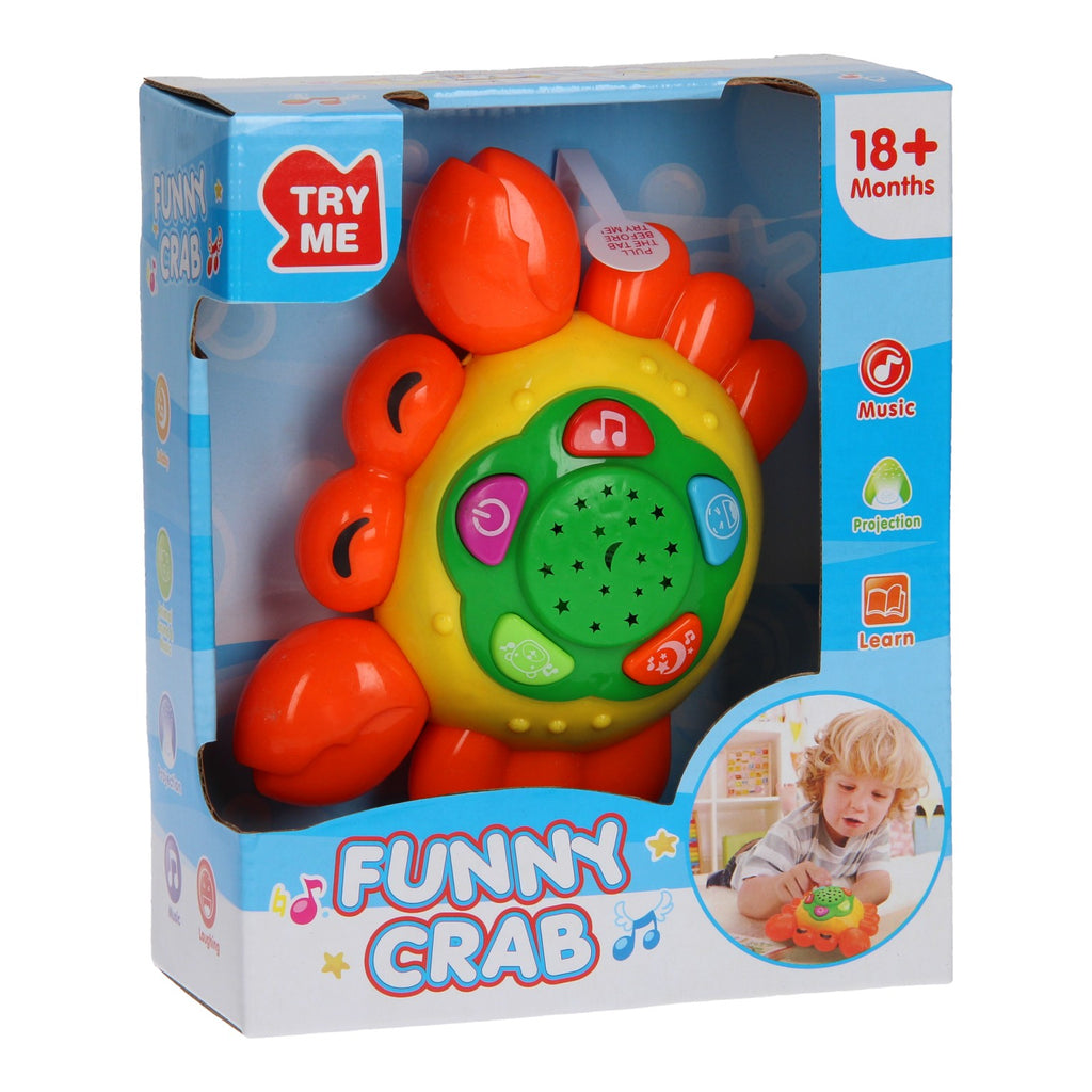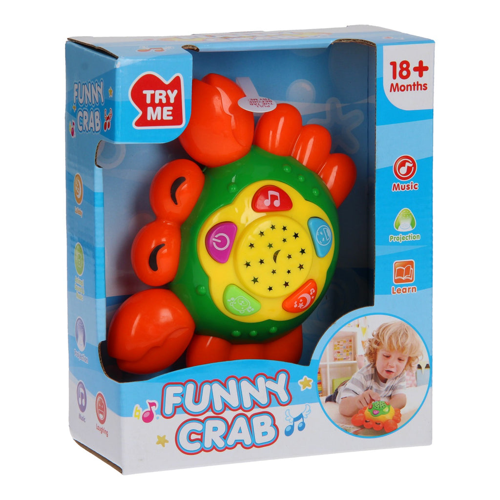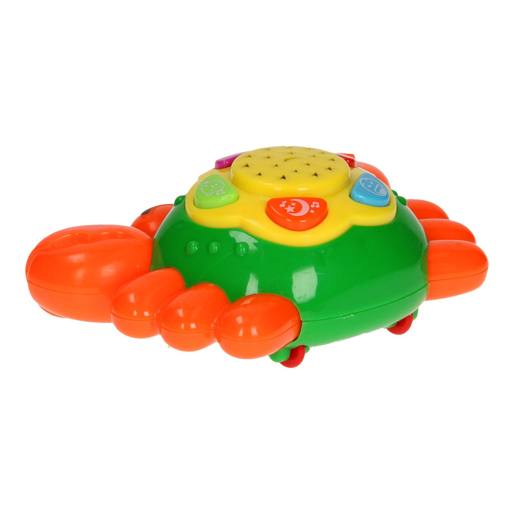 Dit Krabbetje speeldier heeft vele leuke functies. Druk op de knopjes boven op het schild van het krabbetje en hoor hoe die lacht, zeegeluiden maakt, een slaapliedje zingt en diverse geluidjes en muziekjes laat horen. Het leuke aan dit speeldier is dat het in de nacht ook een sterrenlicht projector is. Het krabbetje is geschikt voor 18+ maanden en werkt op 2x AAA batterijen (batterijen zijn inbegrepen).