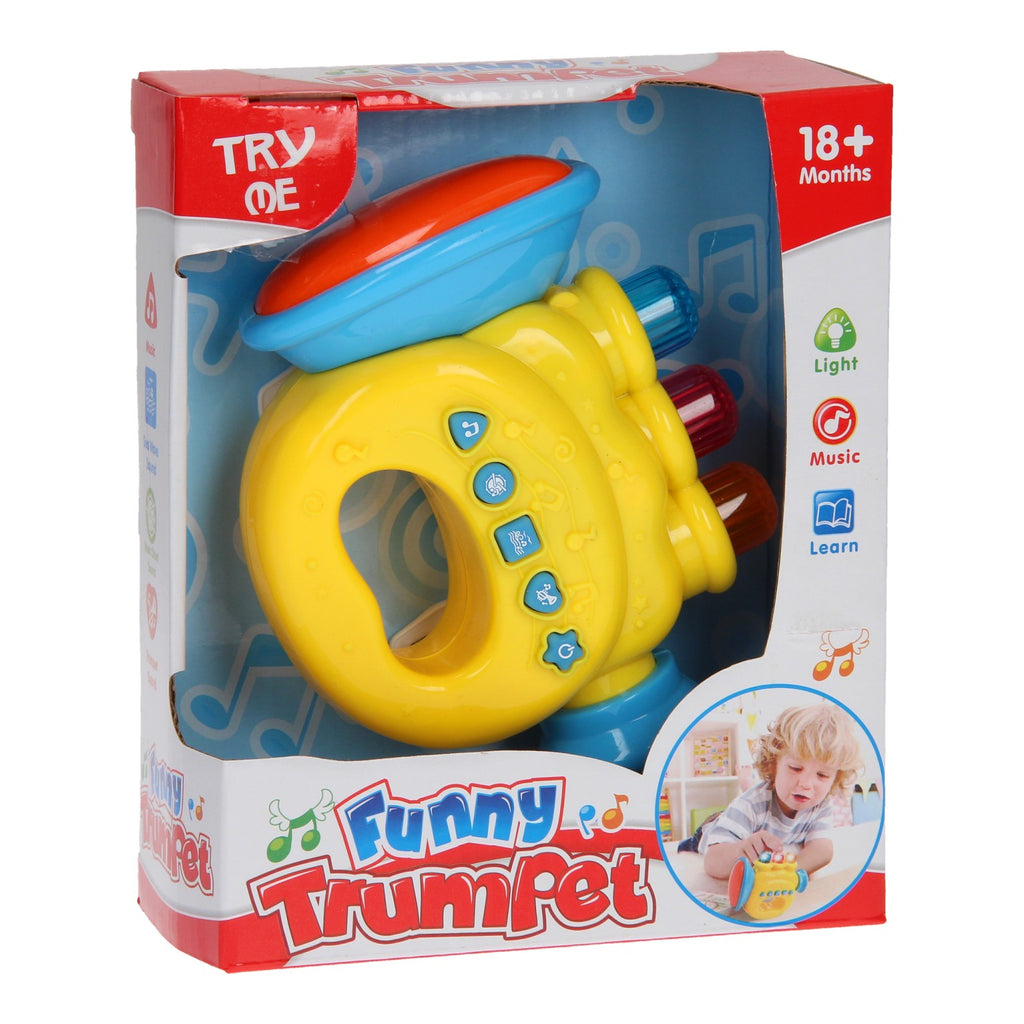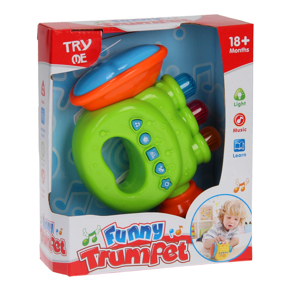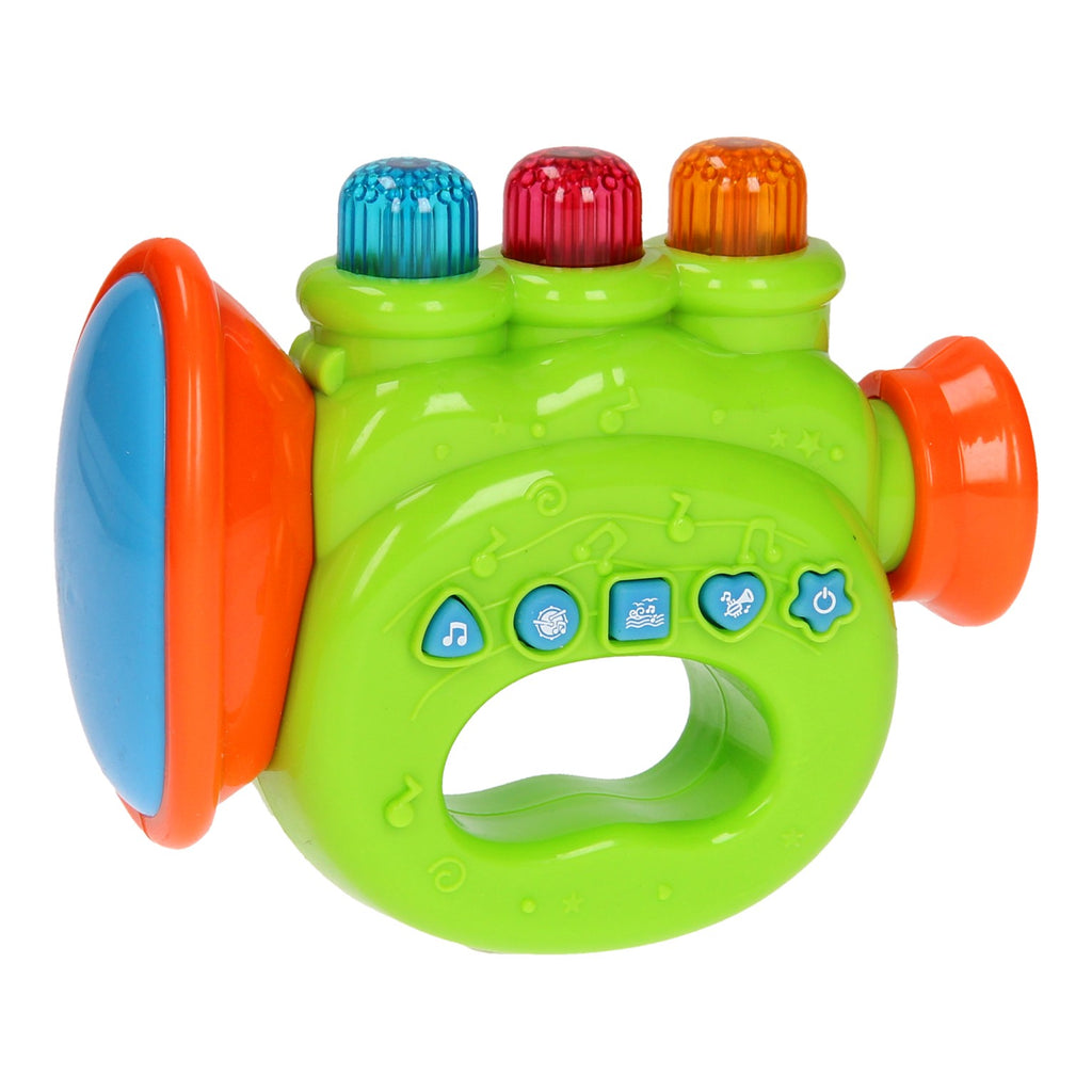 Dit trompet speelinstrument heeft vele leuke functies. Druk op de knopjes en hoor verschillende leuke geluidjes en muziekjes. De knoppen van de trompet geven ook licht. De trompet is geschikt voor 18+ maanden en werkt op 2x AAA batterijen (batterijen zijn inbegrepen).