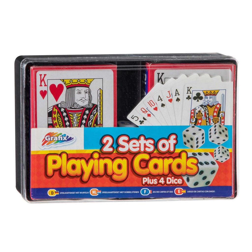 Deze speelkaartenset met dobbelstenen is ideaal voor een spelletjesavond. De set bevat twee pakjes kaarten en 4 dobbelstenen. Kies een spel die je gaat spelen of verzin je eigen spel met je vrienden en dobbel erop los. Ga je voor een potje pesten of toch ezelen? Zorg ervoor dat jij wint, maar niet vals spelen natuurlijk!