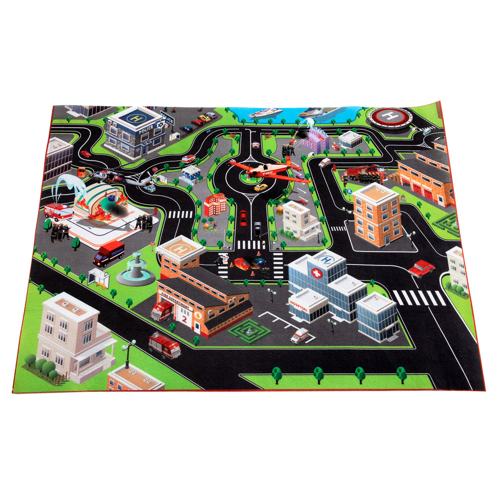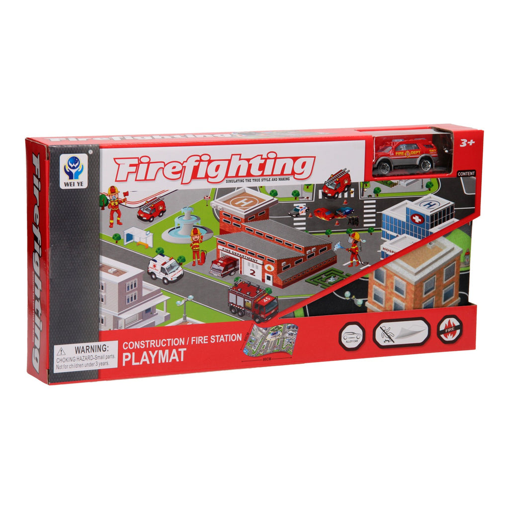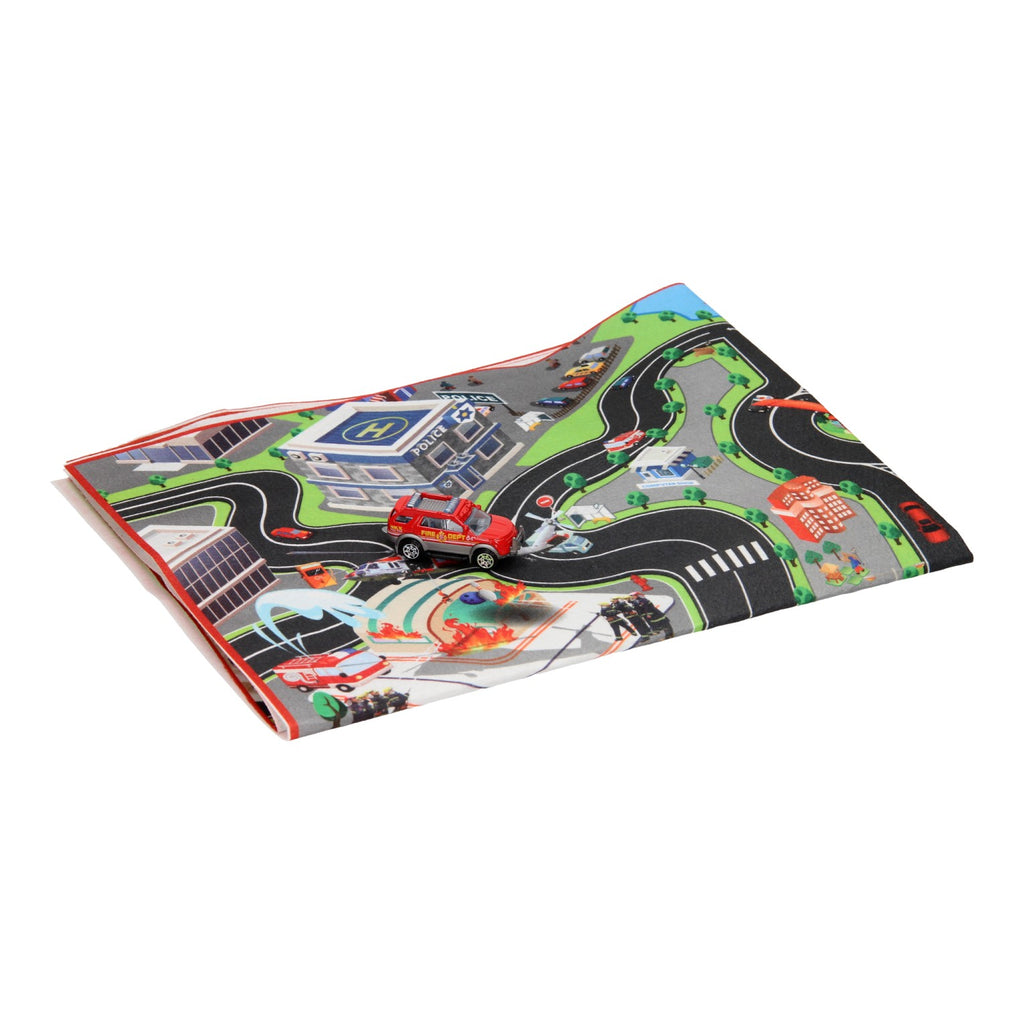 Wilde jij altijd al brandweerman worden?! Dat kan nu met dit gave speelkleed! Er gebeurt van alles op de weg waar de brandweerman bij moet komen. Help jij de brandweerlieden alles in het gareel te houden? Inclusief speelkleed en brandweerauto. De speelmat is 80 x 60 cm.