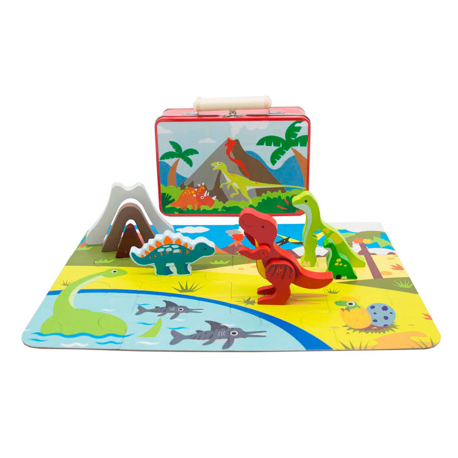 Speelkoffer met allerlei dinosaurus speelgoed. Inhoud: 4 dino's, 1 vulkaan bestaande uit 3 delen, 1 puzzel van 12 stukjes.