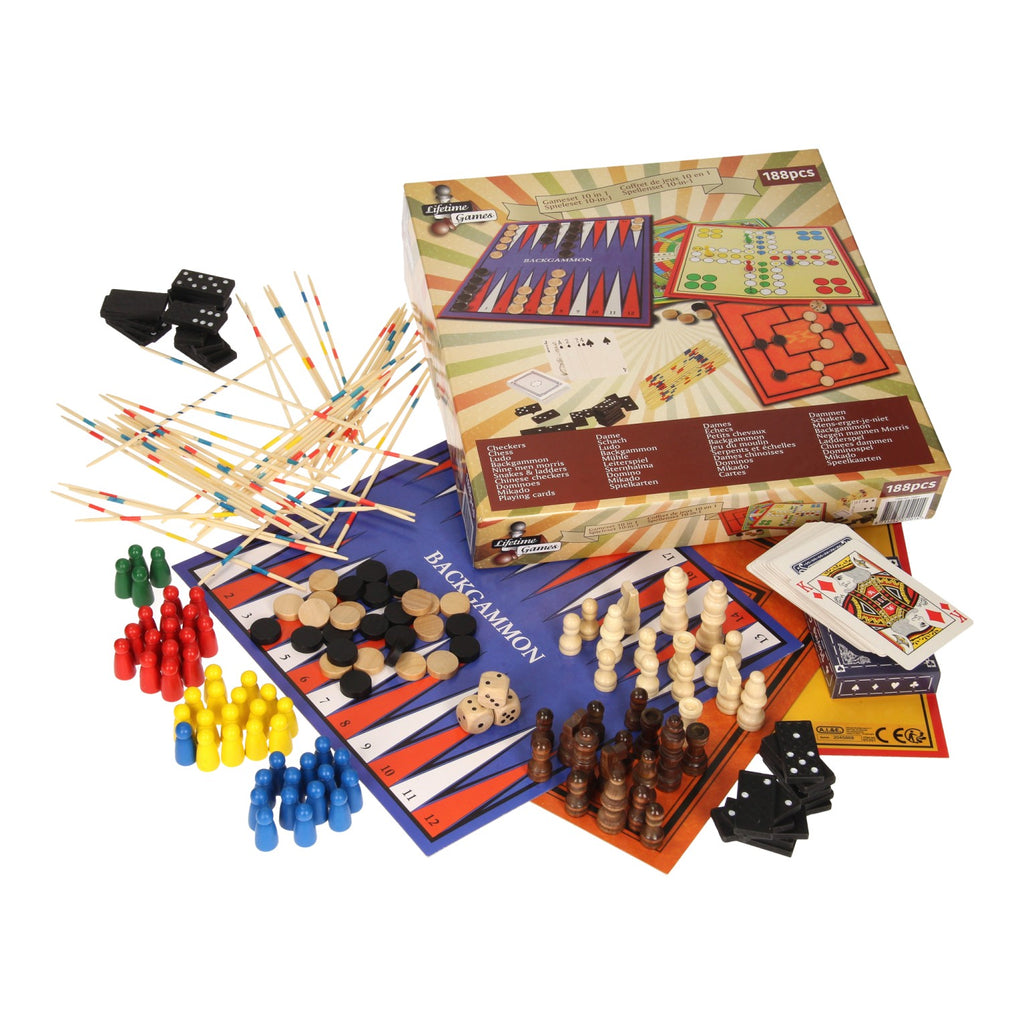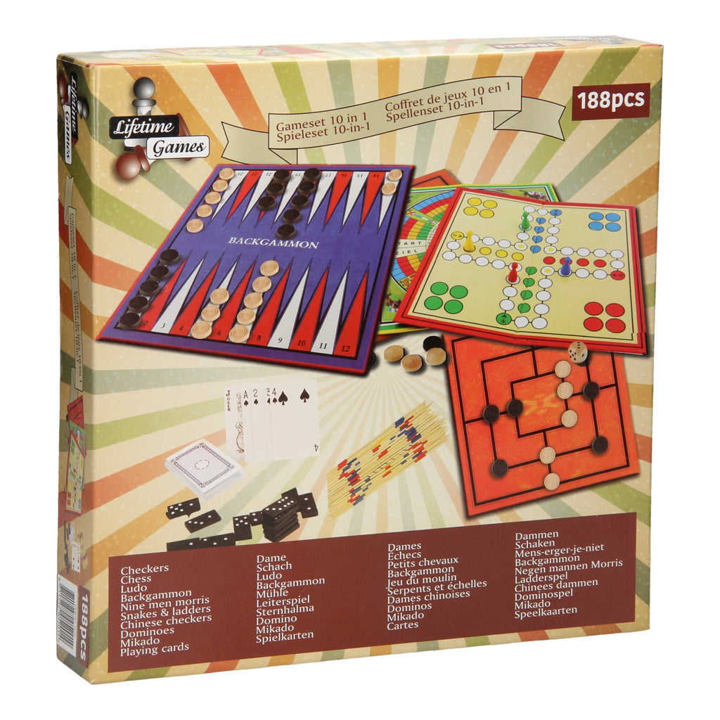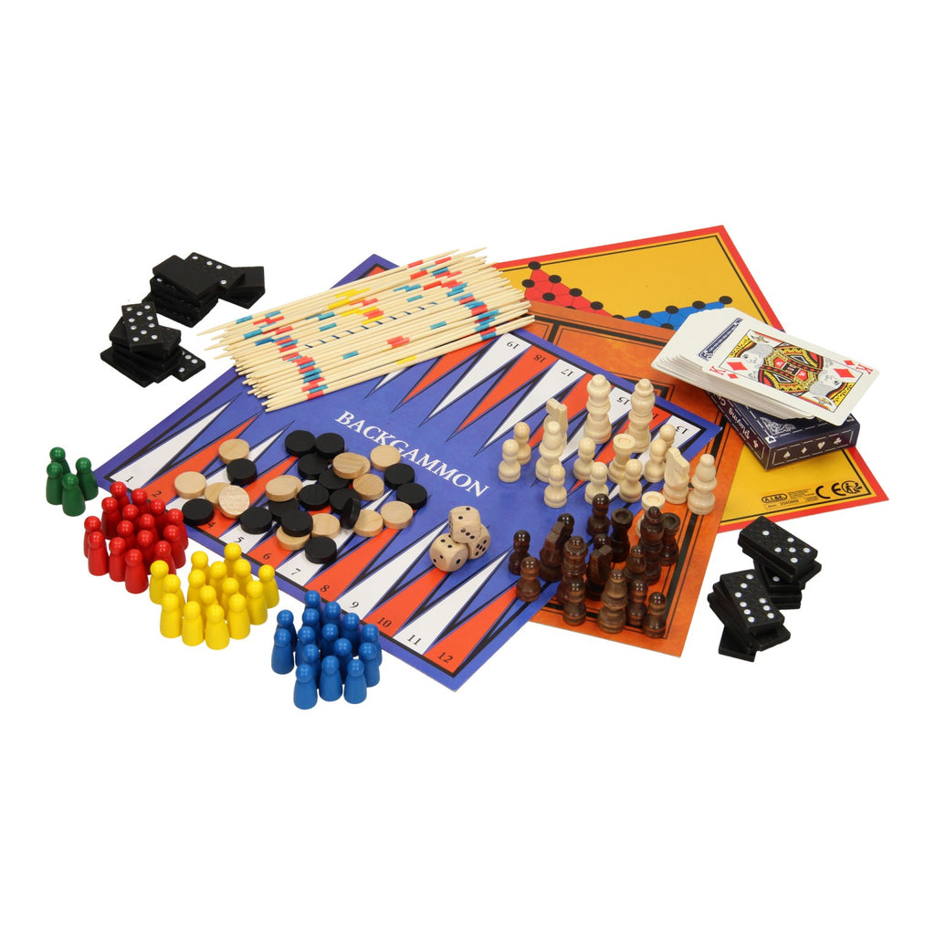 In deze spellendoos zitten genoeg spellen voor een avond vol met plezier. In de box zitten de spellen schaken, mikado, dammen, mens-erger-je-niet, slangen en ladders, molenspel, chinees dammen, domino, een set speelkaarten en backgammon.