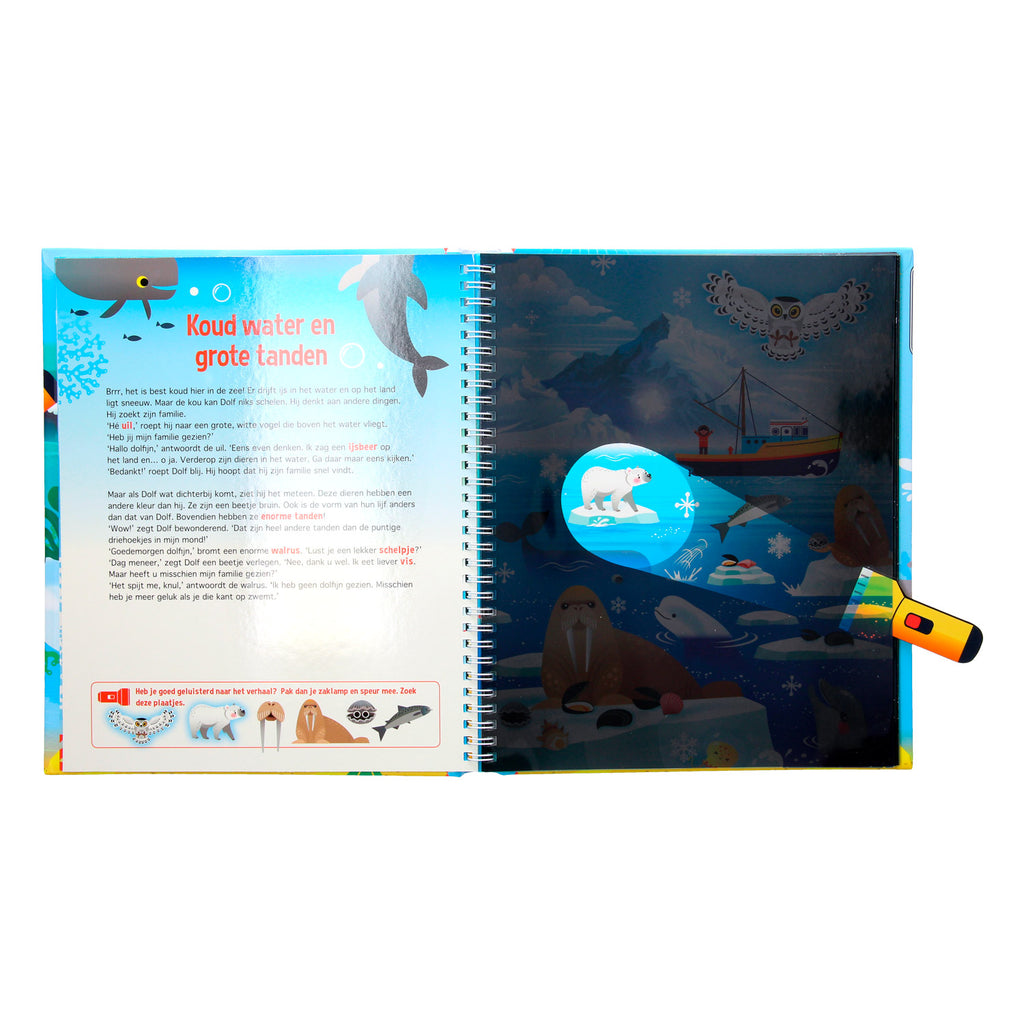 Maak kennis met Dolf en zijn familie in de zee! Het boek begint met een educatief stuk over het dier de dolfijn. Hier kom je ook gelijk de kartonnen zaklamp tegen. Vervolgens begint er een verhaal met dikgedrukte woorden over de kleine, dappere dolfijn Dolf. Deze dikgedrukte woorden staan onderaan de pagina afgebeeld. De rechterpagina is nu nog donker, maar als je de zaklamp hier achter plaatst ontstaat er een lichtbundel, net echt! Met de zaklamp kan er samen gezocht worden naar de afgebeelde dikgedrukte woorden. Zo lees je samen interactief een boek.