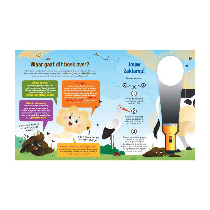 Het boek begint met leuke weetjes en feitjes over poep en scheetjes. Hier kom je ook de kartonnen zaklamp tegen. Deze zaklamp heb je nodig voor de pagina's die volgen. In het verhaal staan namelijk gekleurde woorden, die je op de rechterpagina kunt zoeken. Maar dat lukt alleen als je de zaklamp gebruikt! Schuif 'm onder de zwarte pagina en je ziet dat er een lichtbundel ontstaat, waarmee je kunt zien wat scheetje Veertje en het drolletje allemaal tijdens hun reis tegenkomen. Bekijk je ook de andere titels in deze serie?