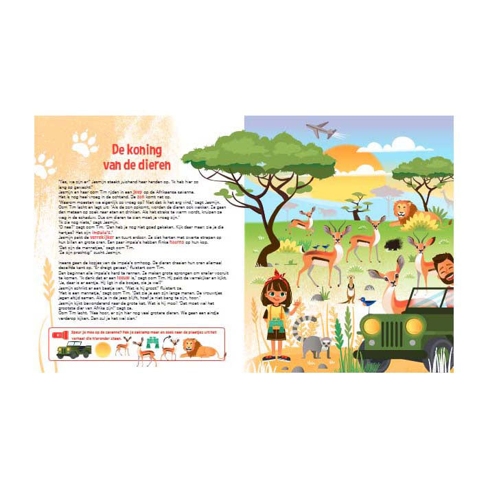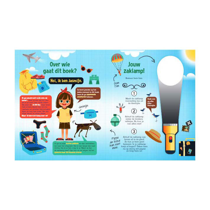 Het boek begint met leuke weetjes en feitjes over Afrikaanse dieren. Hier kom je ook de kartonnen zaklamp tegen. Deze zaklamp heb je nodig voor de pagina's die volgen. In het verhaal staan namelijk gekleurde woorden, die je op de rechterpagina kunt zoeken. Maar dat lukt alleen als je de zaklamp gebruikt! Schuif 'm onder de zwarte pagina en je ziet dat er een lichtbundel ontstaat, waarmee je kunt zien wat Jasmijn allemaal beleeft. Bekijk je ook de andere titels in deze serie?