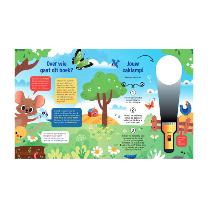 Muisje Bikkel zoekt een plek om lekker te slapen. Hij komt terecht op een boerderij. Maar het is nog niet zo gemakkelijk om daar een rustig plekje te vinden! Haal de kartonnen zaklamp uit dit boek en ga op zoek!