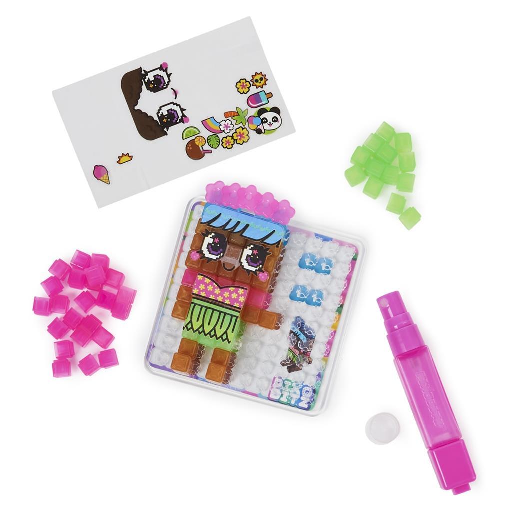 Laat je creativiteit de vrije loop met het Spin Master PixoBitz doorzichtige kralenpakket. Dit doe-het-zelfpakket heeft alles wat je nodig hebt om je eigen 3D- en 2D-pixelkunst te maken die aan elkaar kleeft met water. Dit pakket bestaat uit 156 unieke doorzichtige bitz (kubusvormige watersmeltkralen) in zes kleuren die je nergens anders vindt, twee accessoires, meer dan 20 waterstickers, een gebruiksvriendelijke sprayfles, een blad en twee sjabloonkaarten. Ga meteen aan de slag met deze set of combineer 'm met de PixoBitz Studio (afzonderlijk verkocht). Volg de sjablonen in deze kralenset en kom tot vijf geweldige eindresultaten (een watermeloen, ananas, dolfijn, avatar en portemonnee) of ontwerp je eigen unieke creaties. Werken met PixoBitz is simpelweg stapelen, sprayen en stylen. Schuif een sjabloon onder het blad en plaats je bitz erop. Dankzij het vierkante ontwerp kun je ze eenvoudig stapelen en rollen ze niet weg. Besproei elke laag en style je creatie. Kies uit verschillende oogstickers, gezichtsuitdrukkingen, schattige icoontjes en meer, en voeg de bloemenkroon of fotoklem toe. Met zo veel doorzichtige bitz, waterdecoraties en accessoires zijn de mogelijkheden eindeloos. Voor het beste resultaat wacht je 20 minuten na elke laag en 45 minuten tot je PixoBitz-kralenkunstwerk volledig hard is geworden voordat je ermee gaat spelen. Gebruik je creaties in creatief fantasiespel of versier er de kinderkamer mee.