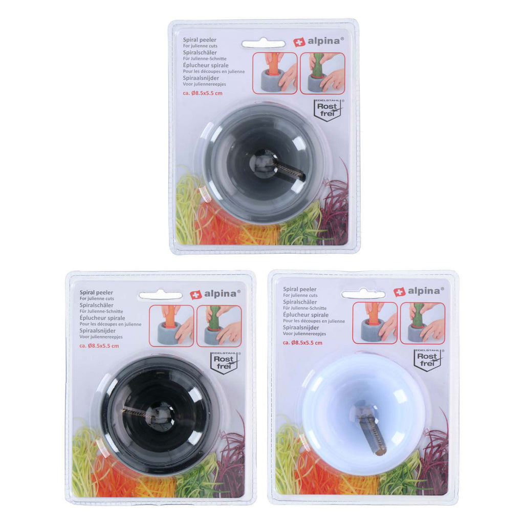 Set van 3 spiraalsnijders in verschillende kleuren. Ideaal voor het maken van groentespiralen voor salades of garnituren. Roestvrij en eenvoudig te gebruiken.