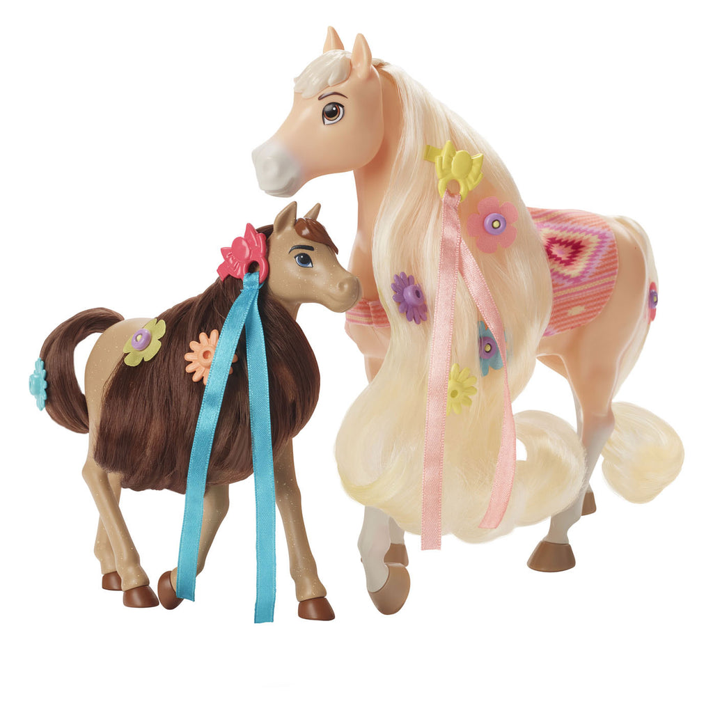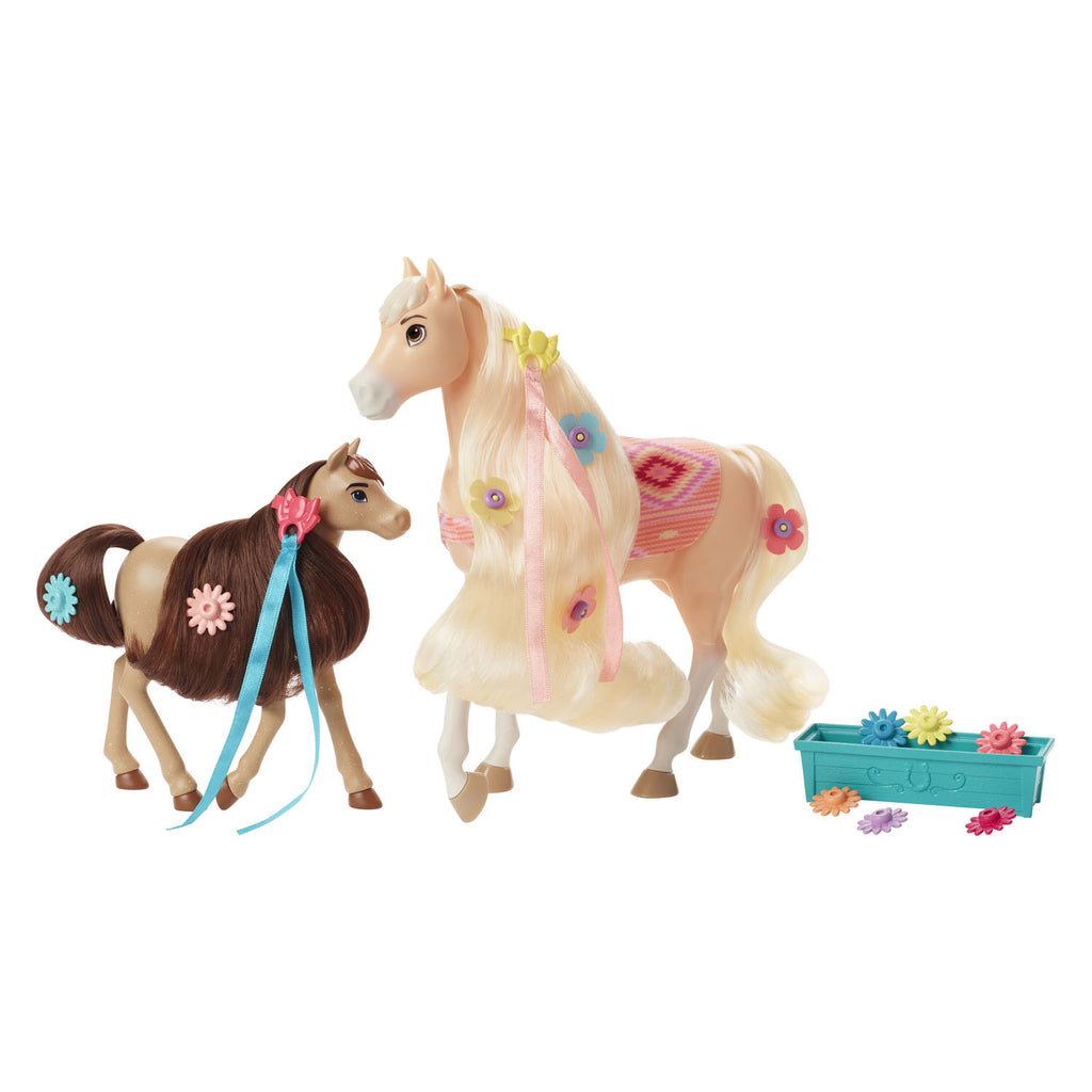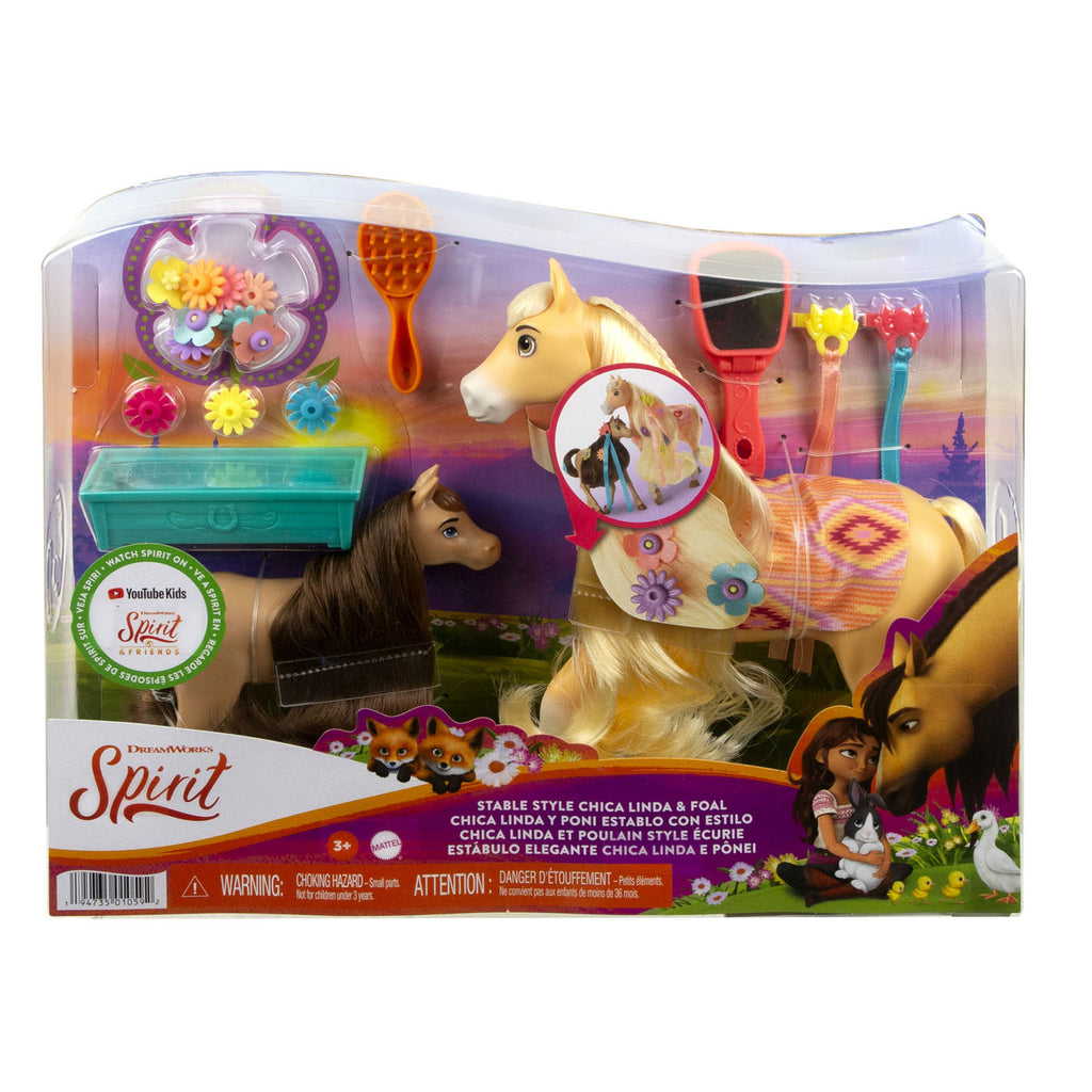 Maak deel uit van de vriendschappen, moedige verhalen en avonturen met Spirit van DreamWorks! Verzorg je paard en bedenk de mooiste verhalen met de Spirit Stal Stijl Chica Linda en Veulen speelset. Inclusief Chica Linda paard (ca. 20 cm), met een kleurrijke deken en een snoezig veulen, ook met lange zachte manen en staart. Bevat ook een hulpje om hun haar te versieren, haarclips in de vorm van een bloem, een borstel, een spiegel en een bak waar alle haar-accessoires in passen. Plaats een haar-accessoire in het haarhulpje, plaats dat op de manen en druk het in om het accessoire vast te zetten in het haar. Kinderen kunnen de manen en staarten op meerdere, kleurrijke manieren versieren met allerlei accessoires. Het ultieme creatieve haarplezier! Afwijkende kleuren en versieringen mogelijk. Een fantastisch cadeau voor kinderen vanaf 3 jaar.