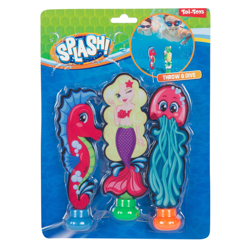 Deze vrolijke set bestaat uit 3 kleurrijke duikvissen in de vorm van zeewezens, zoals een zeemeermin, kwal en zeepaardje of een schildpad, haai en dolfijn. Niet geschikt voor kinderen onder de 3 jaar oud.