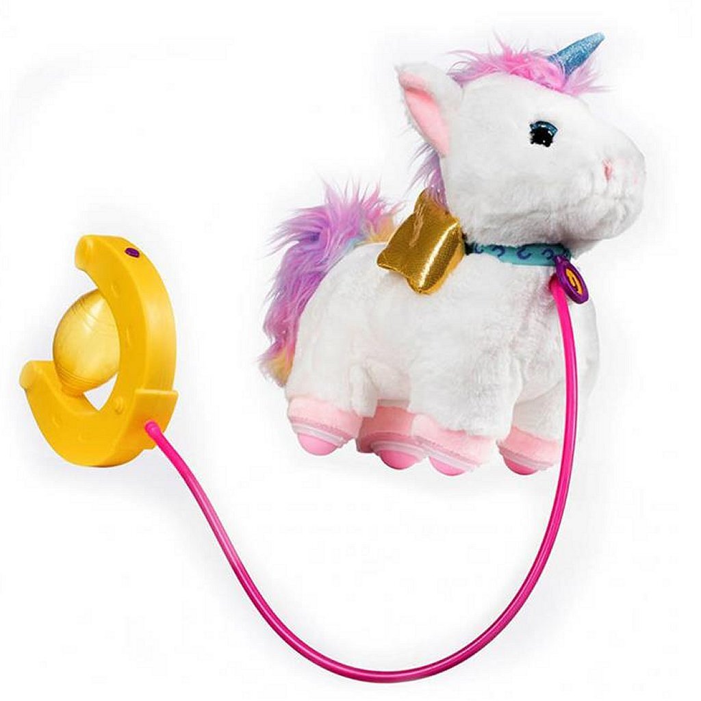 Deze snelle eenhoorn volgt je overal! De speciale pootjes zorgen ervoor dat je jouw Sprint eenhoorn eenvoudig kunt uitlaten met de uitlaatriem. Knijp in het handvat en zijn oren en staart bewegen! Deze vrolijke unicorn maakt enhousiast geluid wanneer je op het speciale knopje op het handvat drukt. Er zit geen electronica in de hond zelf, dus knuffelen met deze unicorn is extra zacht!
