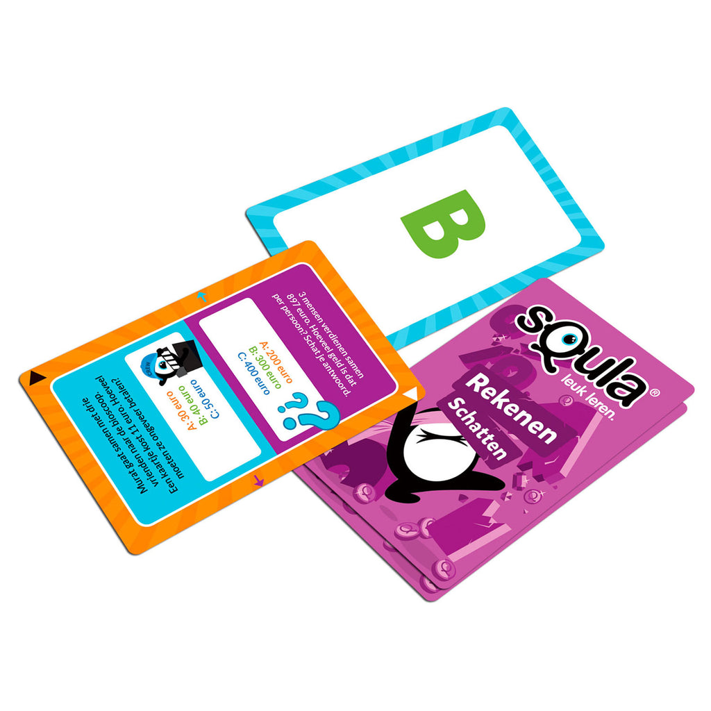 Squla. Leuk leren! nu ook als kaartspel te spelen. In dit spannende kaartspel geef je zo snel mogelijk te juiste antwoord op een schattingsvraag door één van je drie antwoordkaarten op te leggen. Heb je de vraag goed en ben je snel genoeg dan krijg je punten en win je het spel. Geschikt voor kinderen in groep 5 - 6.
