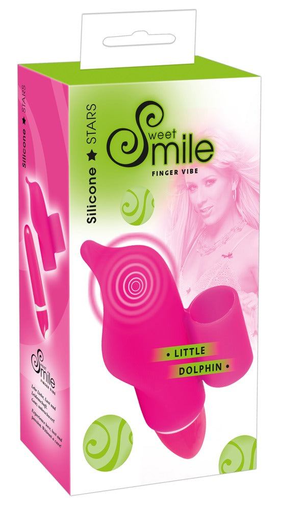Pink finger vibrator in a playful dolphin shape with a removable mini vibrator and 7 vibration modes at the push of a button. Complete length 9.5 cm, vibrator Ø: max. 2 cm. Material: silicone, ABS. Includes battery.