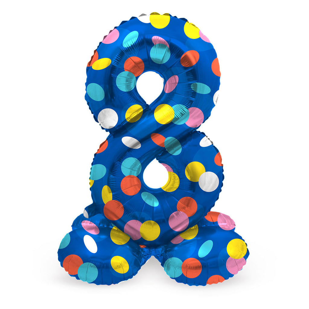 Staande Folieballon Cijfer 8 Colorful Dots - 72 cm. Inhoud: 1 folieballon. Kleur: meerkleurig. Bijvoorbeeld te gebruiken tijdens de volgende feestgelegenheid/feestgelegenheden: Verjaardag, Kinderfeestje en Themafeest. Deze folieballon is 72 cm en kan gevuld worden met lucht (geen helium nodig). Het artikel is gemaakt van folie.