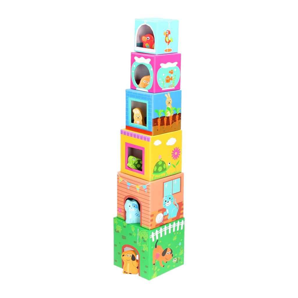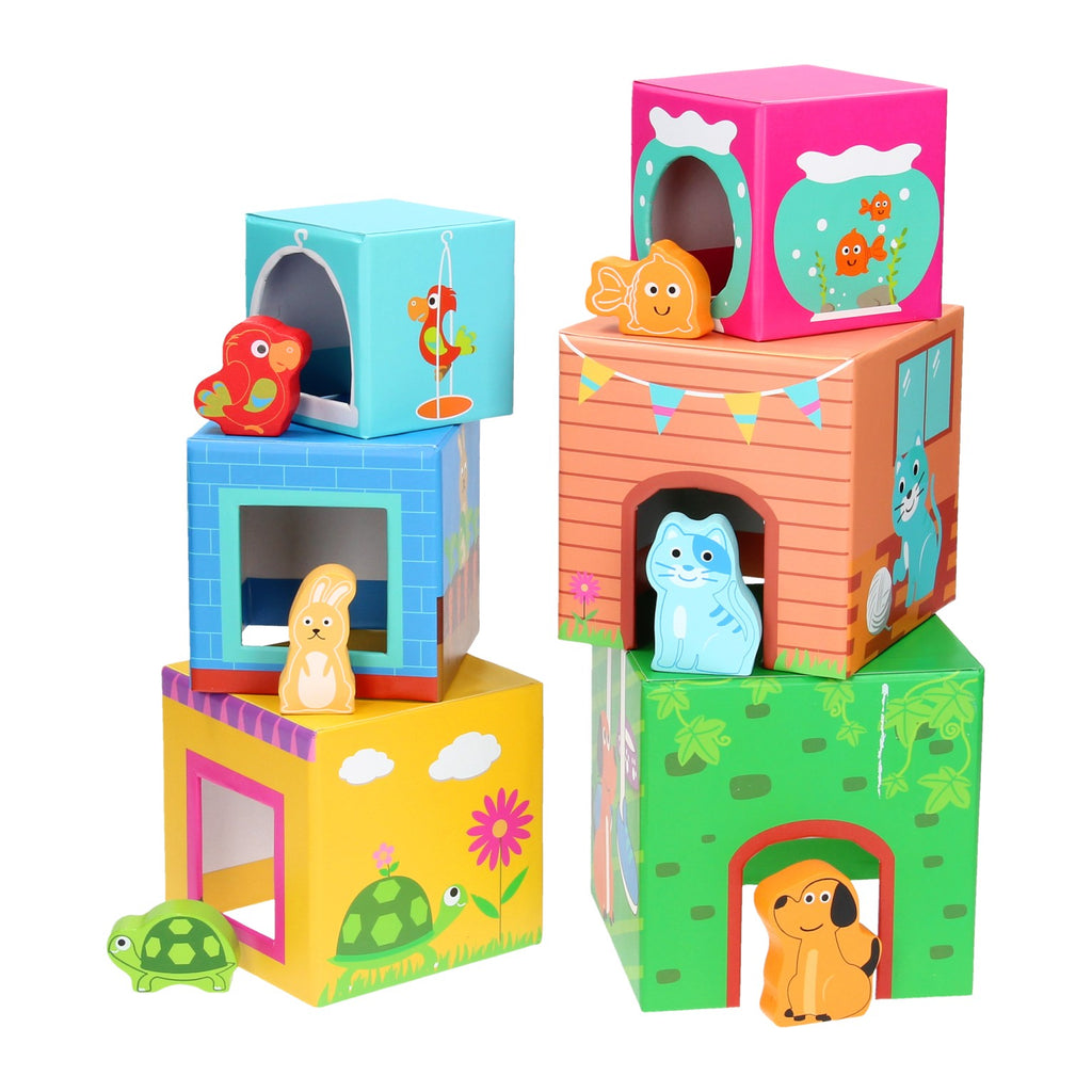 Stapelaars opgelet! Wie bouwt de hoogste toren? In de juiste volgorde resultaat laten de blokken verschillende motieven zien. Alle stapelblokken hebben een opening, waarin zes verschillende houten dieren een thuis vinden.