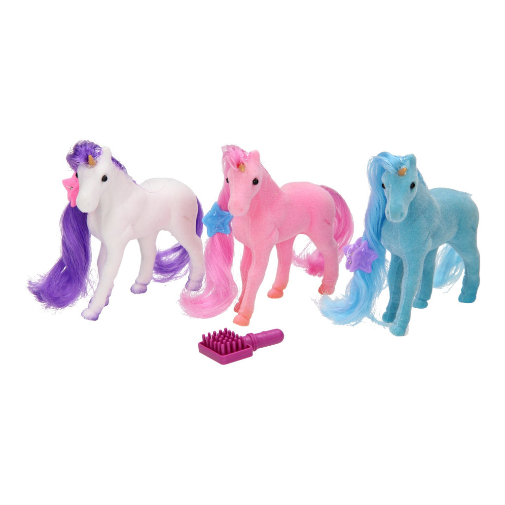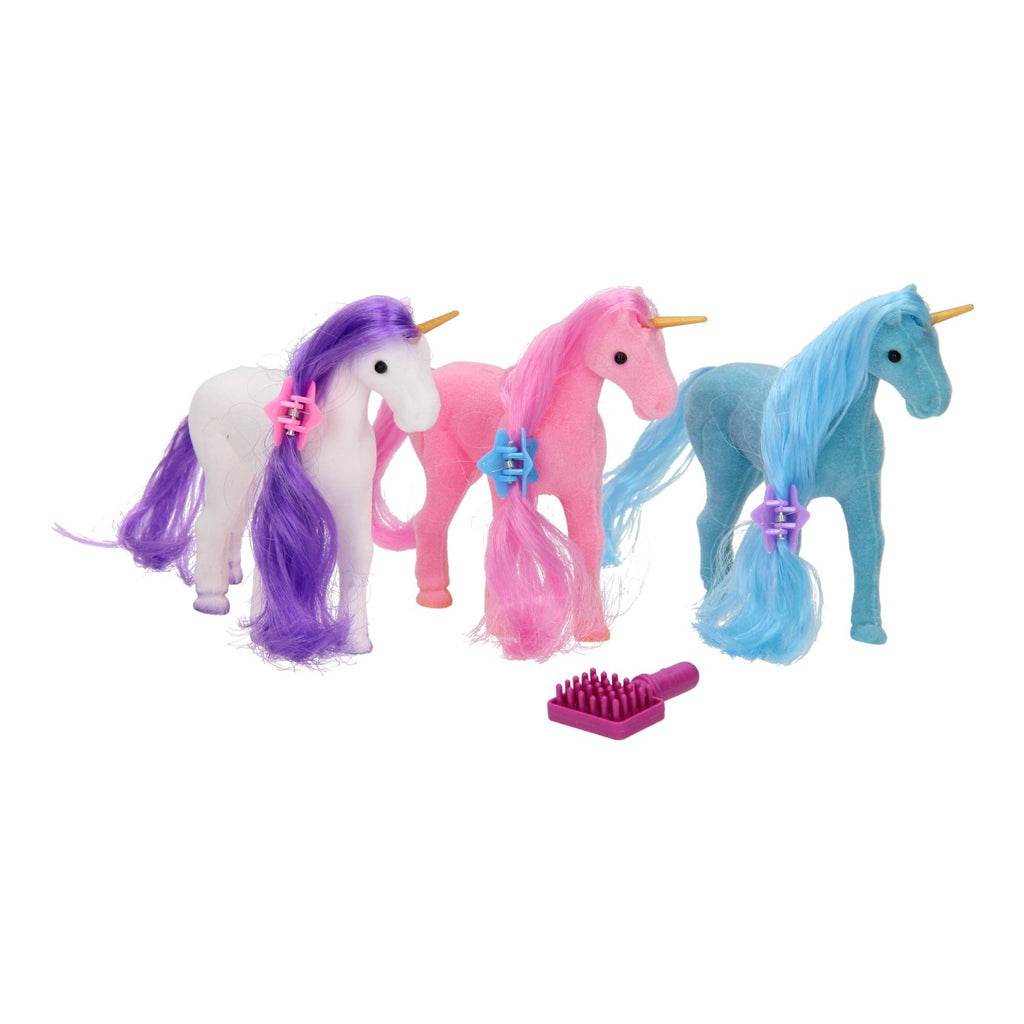Wauw! Een stal gevuld met eenhoorns! De speelset bestaat uit drie eenhoorns in een roze, witte en blauwe kleur. De gekleurde lange haren van de eenhoorns zijn zacht net als de staart. De eenhoorns kun je verzorgen met de kam en het haar kun je nog mooier maken met de sterren knipjes. De eenhoorns zijn ongeveer 10 x 6 cm. Geschikt vanaf 3 jaar.