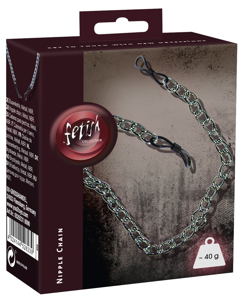 Silver-coloured, 34 cm long metal chain with black nipple loops to lash.