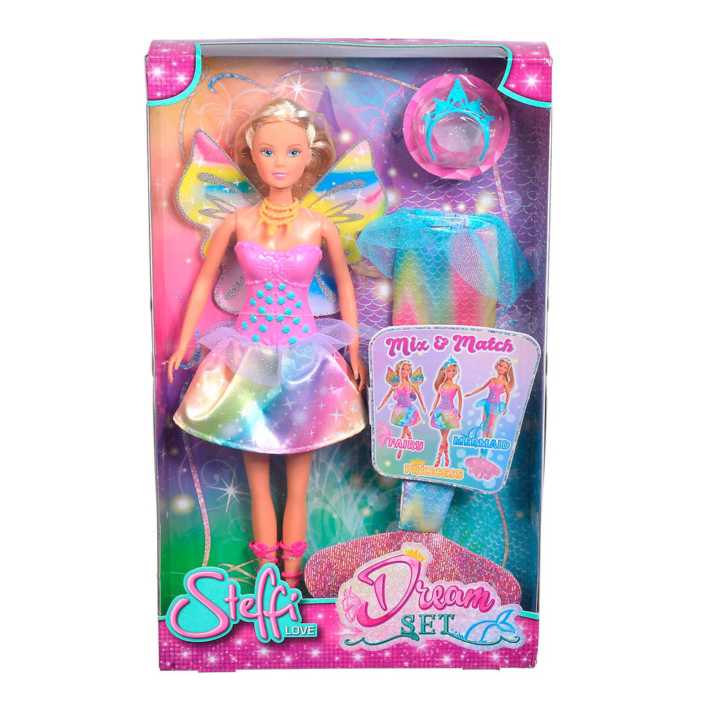 Met deze set kun je Steffi veranderen in drie verschillende Steffi's! Namelijk een elfje met vleugels, een prinses met een kroon of een zeemeermin met een mooi gekleurde staart! Eindeloos veel speelplezier met deze 3 in 1 set van Steffi Love!