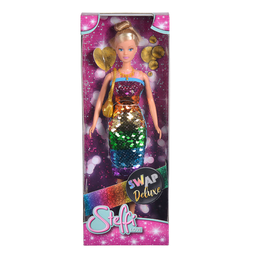 De jurk van Steffi is twee jurken ineen! Aan de ene kant heeft deze regenboogkleurige pailletten, en als je hem binnenste buiten keert, zijn de pailletten verschillende metallic kleuren! Samen met de ketting, de tas en de hakken is deze outfit helemaal af.