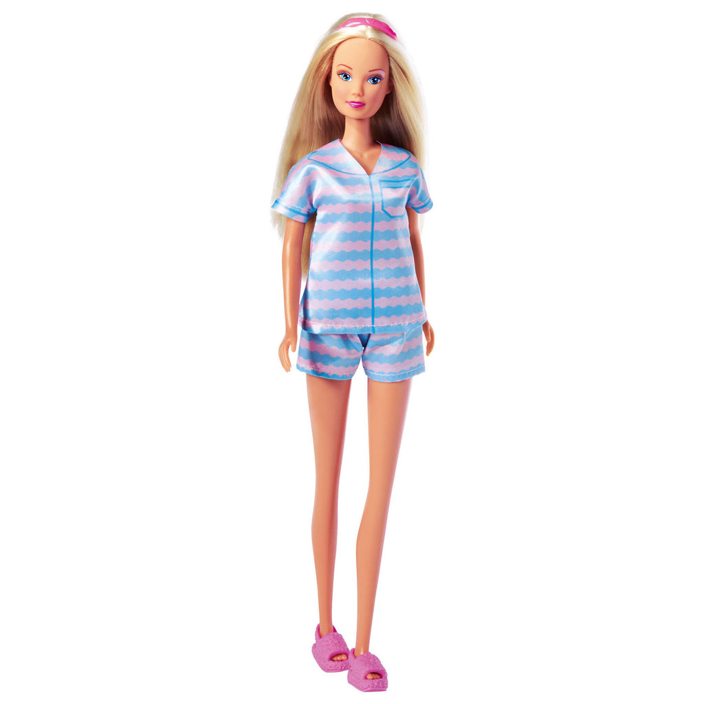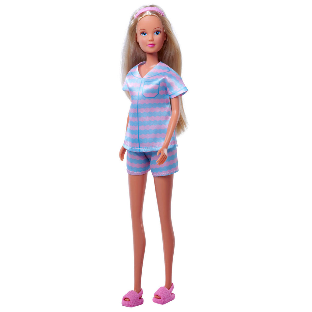 Steffi trakteert zichzelf graag op wat tijd voor zichzelf en heeft een modieuze korte pyjama aangetrokken. Ze draagt ??ook stoere roze pantoffels. In deze outfit is ze helemaal klaar voor haar verwendagje!