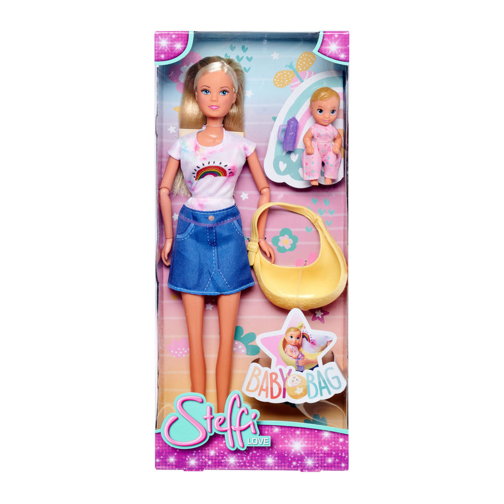 Steffi Love pop met een draagzak voor de kleine baby. Inhoud: Steffi Love modepop, draagzak, baby en een drinkfles voor de baby.