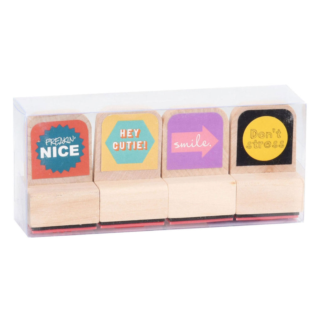Set van 4 houten stempels met Engelse teksten erop. Afmetingen: 3 x 3 x 5 cm.