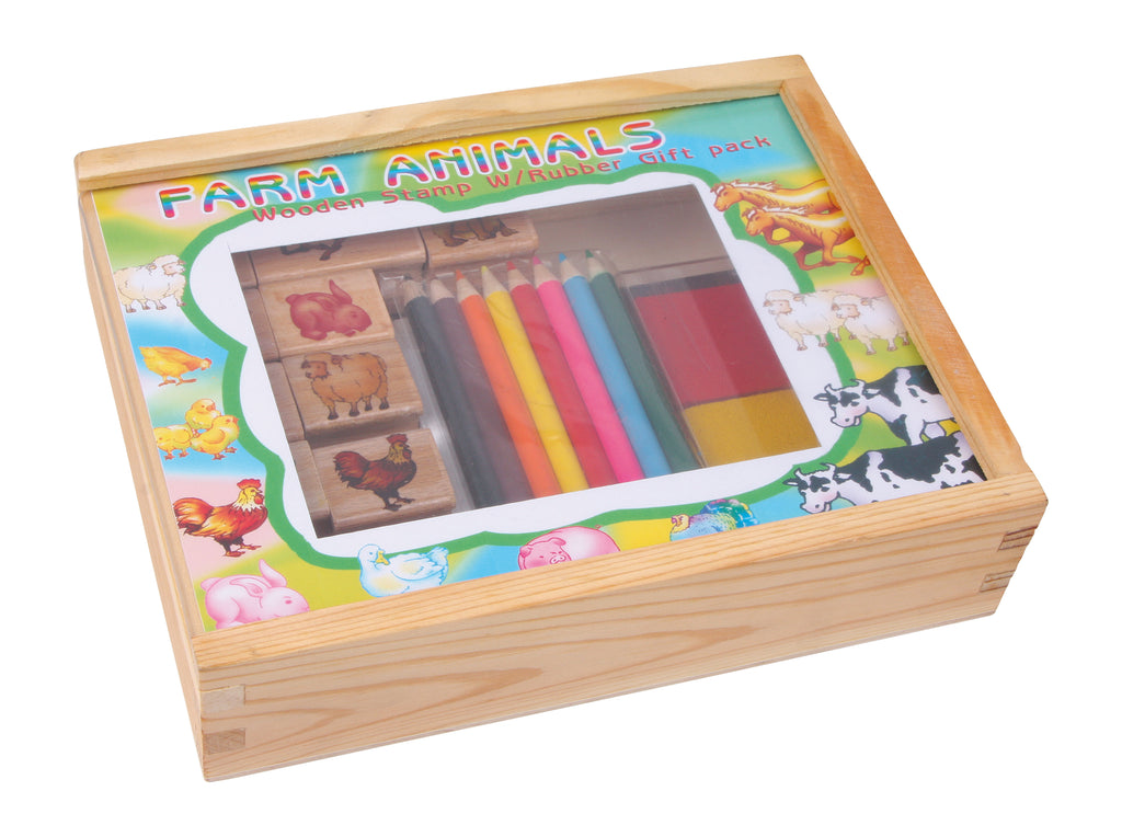 De bewoners van een boerderij verschijnen op vellen papier met deze 9 stempels en 2 inktkussens! 8 krijtjes zorgen voor kleurrijke ontwerpen en personages en als je de houten doos met venster verplaatst, is er meer ruimte voor nog meer accessoires.