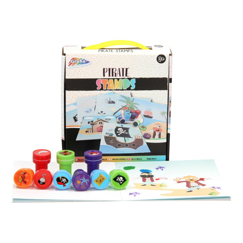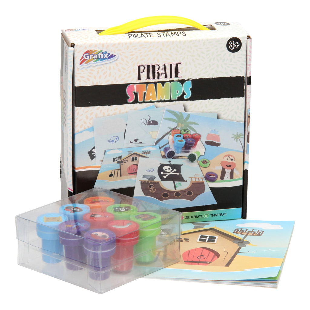 Deze stempelset bestaat uit 9 piratenstempels en een scheurblok met 10 piratenprenten en 5 lege pagina's. Stempel er op los met de schatkist, de piraat met zijn ooglapje of de papegaai. De stempels en het scheurblok zitten verpakt in een stevig kartonnen doosje. Geschikt vanaf 3 jaar.