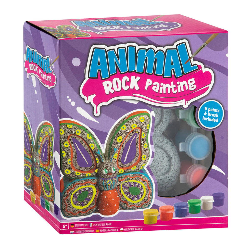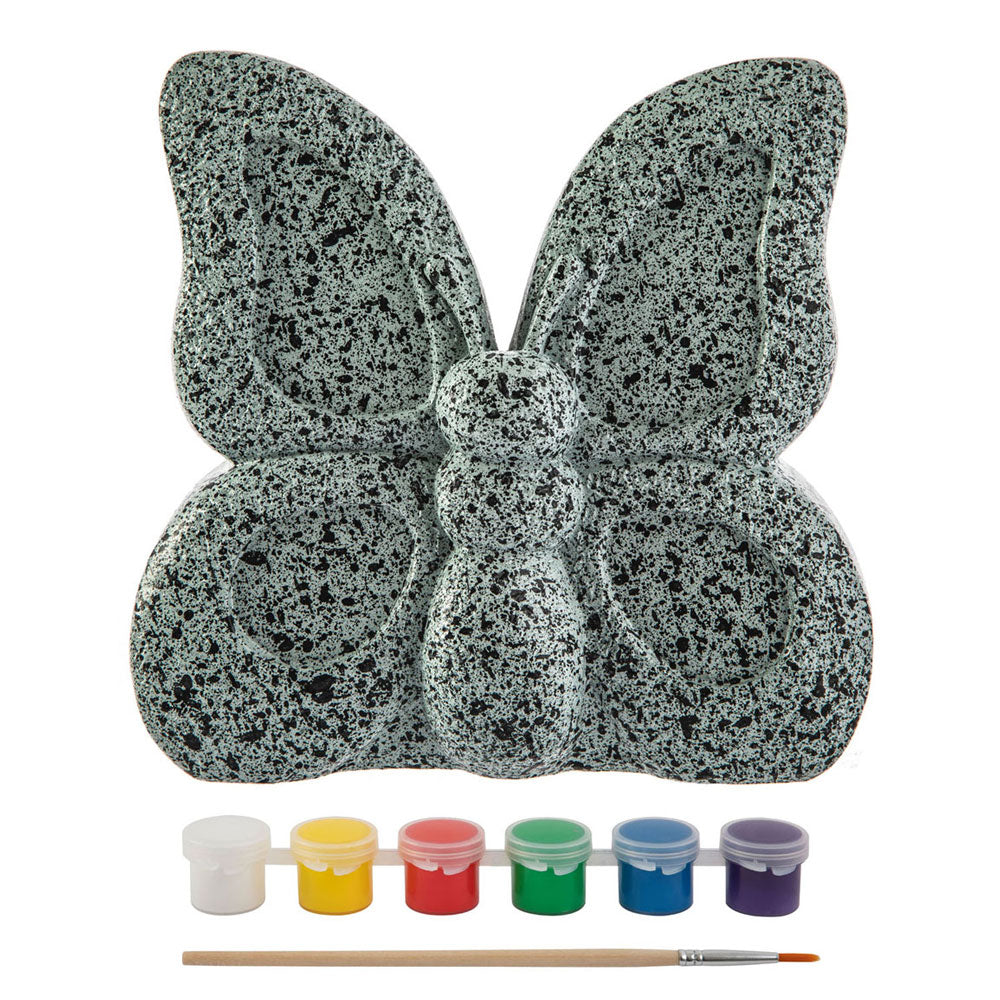 Versier je eigen vlindervormige steen met de 6 meegeleverde verfkleurtjes en het kwastje. De steen is 12 centimeter groot. De knutselset is geschikt voor kinderen vanaf 5 jaar oud.