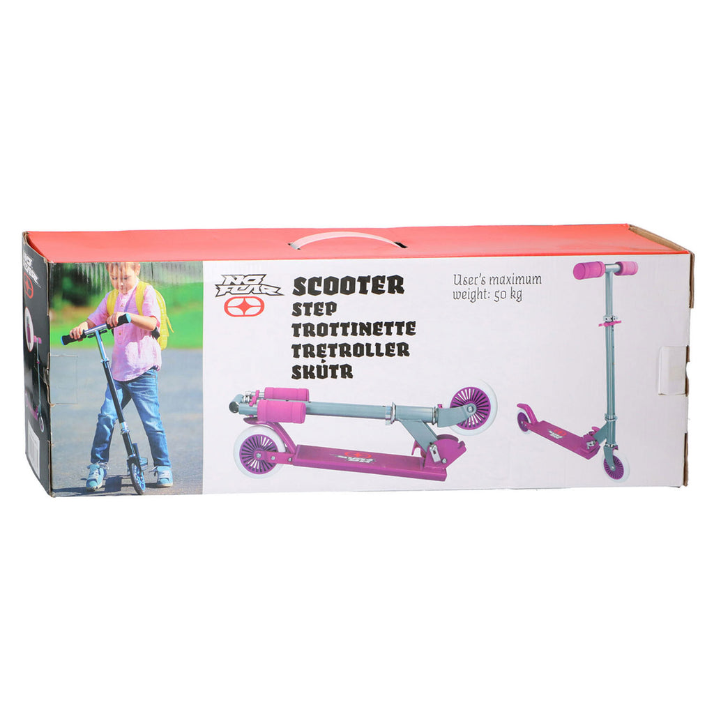 Roze step. Afmetingen: 32 bij 70 bij 66 centimeter.
