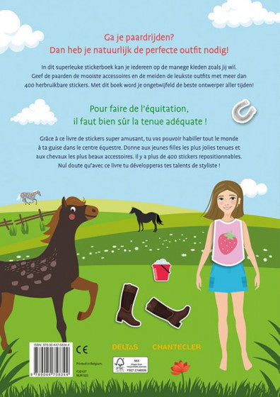 Ga je paardrijden? Dan heb je natuurlijk de perfecte outfit nodig! In dit superleuke stickerboek kan je iedereen op de manege kleden zoals jij wil. Geef de paarden de mooiste accessoires en de meiden de leukste outfits met meer dan 400 herbruikbare stickers. Met dit boek word je ongetwijfeld de beste ontwerper aller tijden!