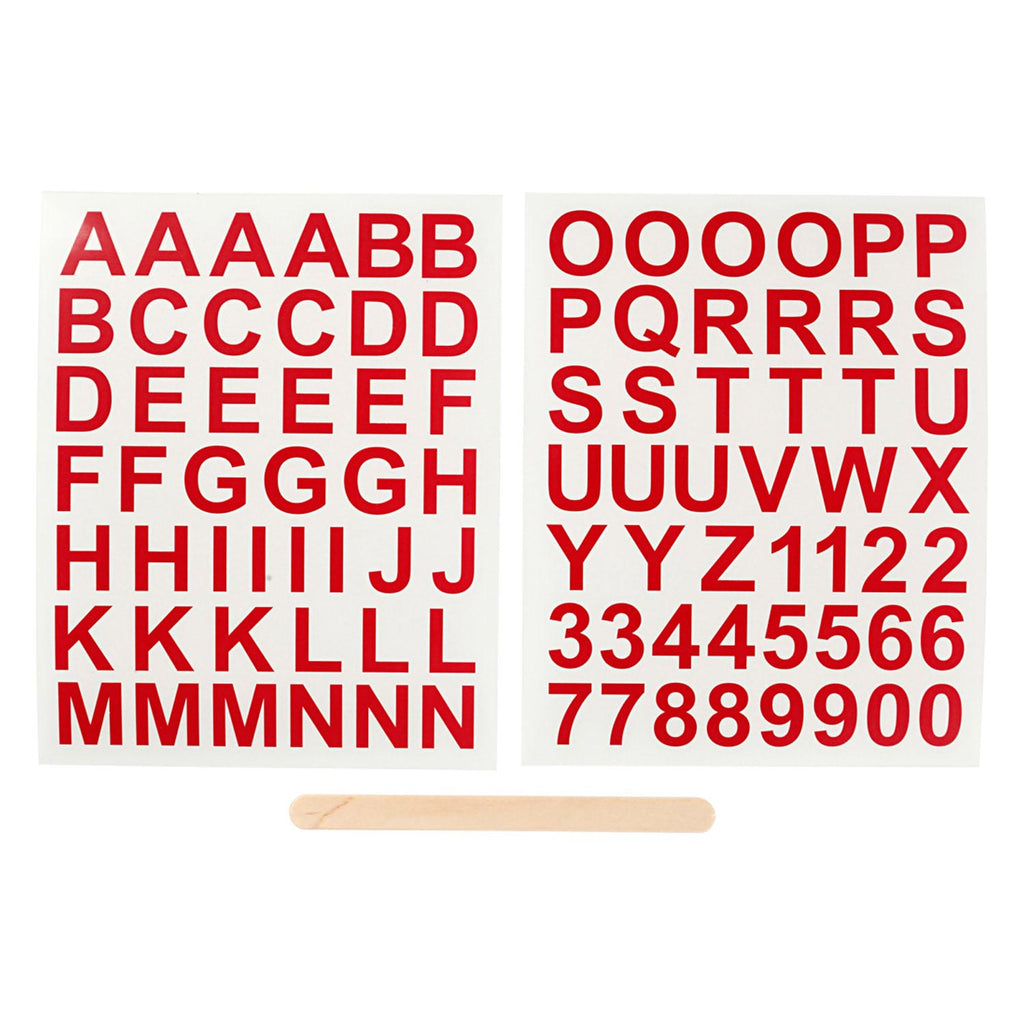 2 vellen met rode stickers van letters en cijfers, te gebruiken op o.a. textiel, papier en nepleer. Inhoud: 2 vellen en een houten applicator. Afm. 12,2 x 15,3 cm.