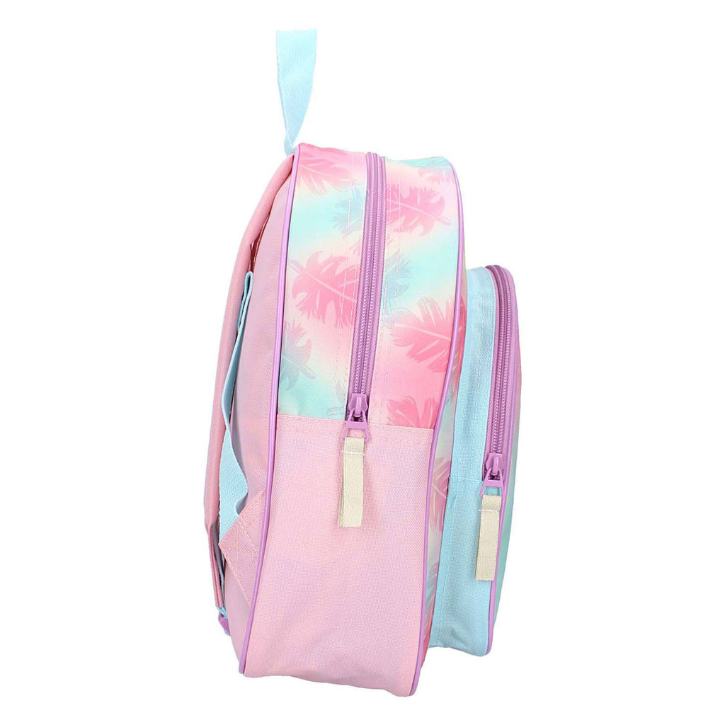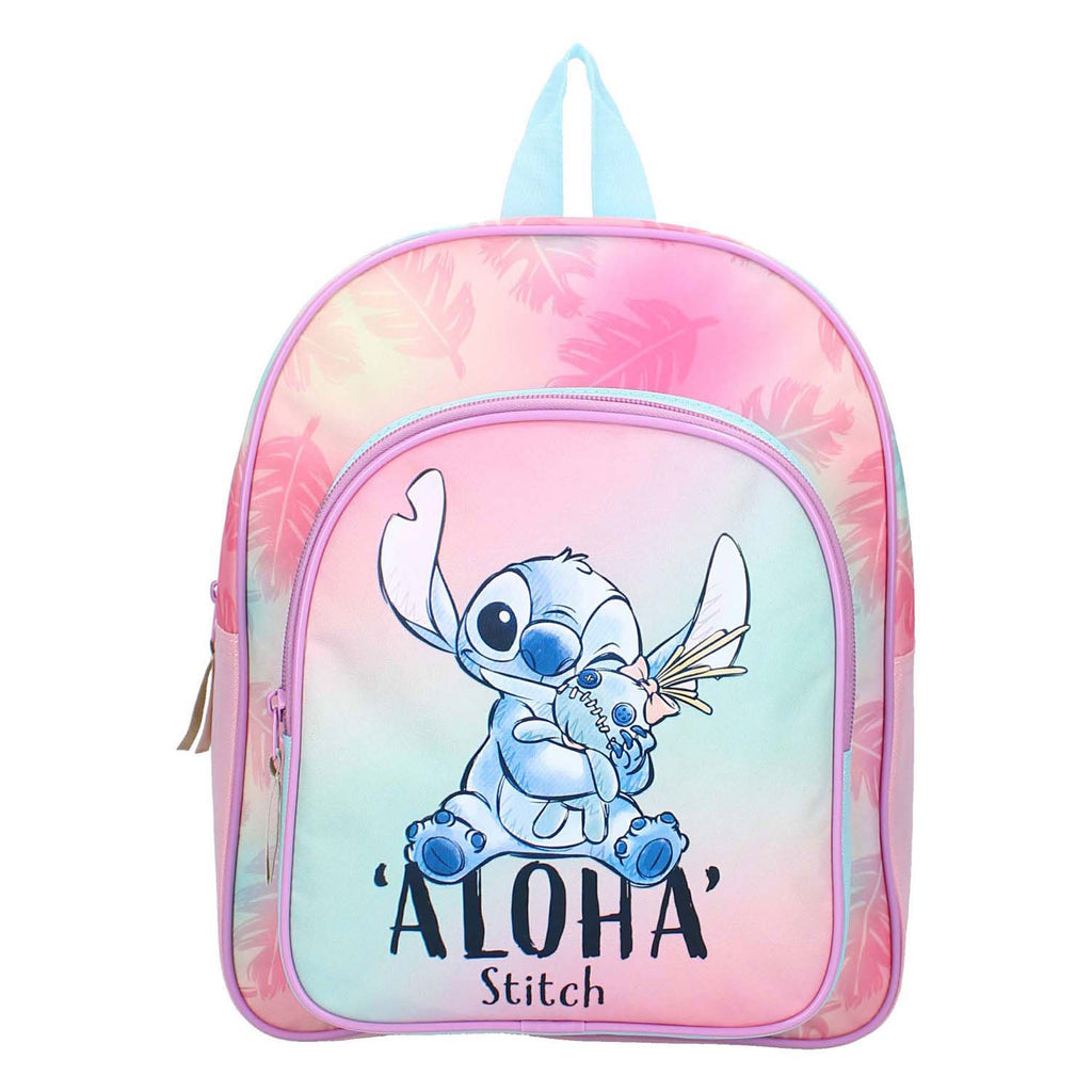 Stitch-rugzak in roze met opdruk van Stitch en "Aloha"-tekst. Voorzien van twee hoofdvakken, verstelbare schouderbanden en zijvakken. Afmetingen: 30 x 25 x 11 cm. Gemaakt van kunststof.