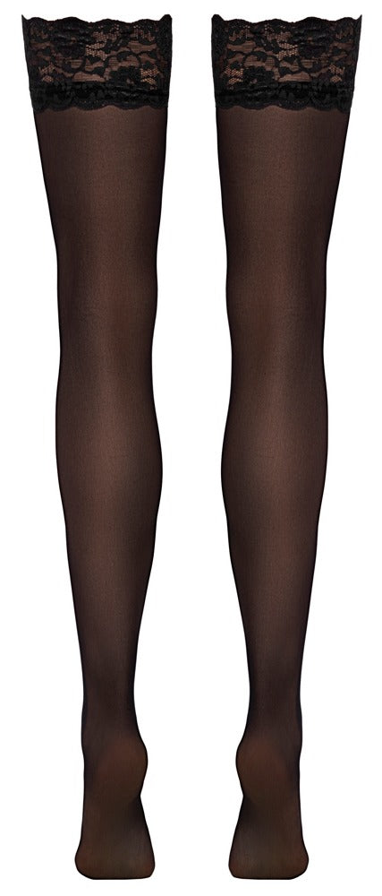Zwarte, zijdeachtige kousen van Cottelli LEGWARE met een elastische, 9 cm brede kanten bovenkant. Garen dikte 20 deniers. Oeko-Tex gecertificeerd.